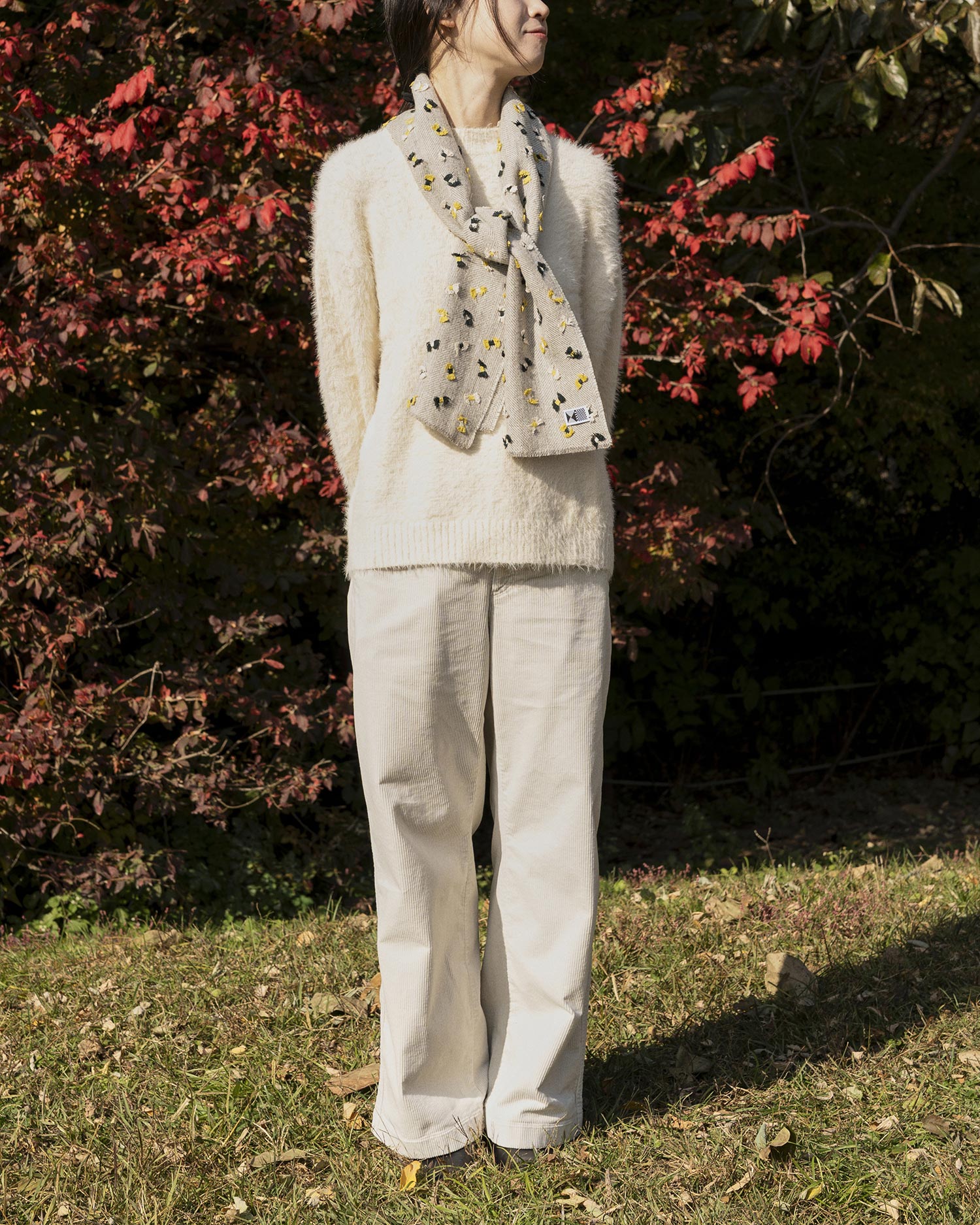 다른 패턴으로 직조된 각각의 면은 그 자체로도 멋스럽지만 직접 착용하였을 때 빛을 발합니다. 방향을 신경 쓰지 않고 자연스레 어우러지도록 겉옷 위에 툭 걸쳐보세요. |