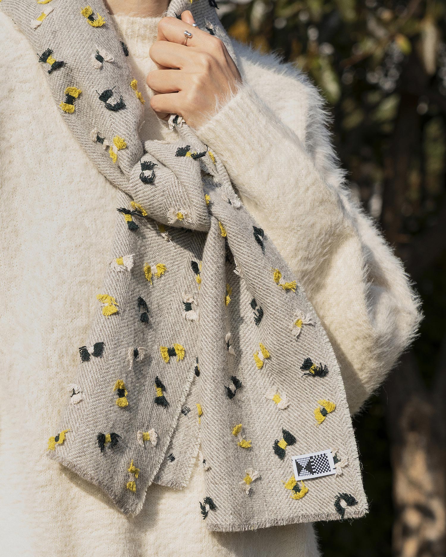 울과 리넨을 엮은 섬세한 레이어와 생동감 있는 노랑 컬러가 특징인 제품입니다. 실감개를 모티브로 한 리본 패턴은 코튼실을 엮어 표현했어요. 언뜻 보면 나비처럼 보이는 리본으로 패턴에 입체감을 더했습니다. |