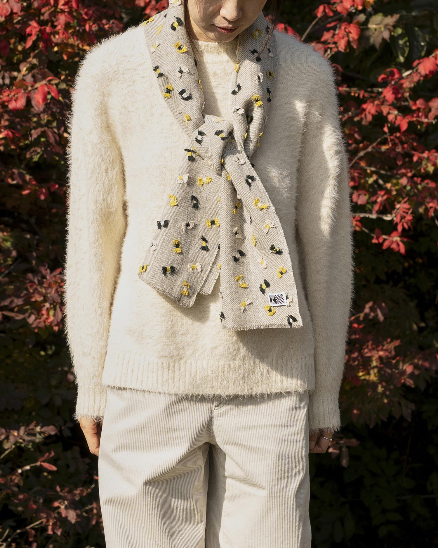 〈kijinokanosei〉는 직조 패브릭을 낭비하지 않고 최소화하기 위해 노력합니다. ¼ 스카프와 스몰 스카프의 크기는 큰 원단을 분할하는 과정에 최적화된 사이즈이며, 원단을 커팅한 흔적 또한 자연스럽게 살려 완성합니다. |