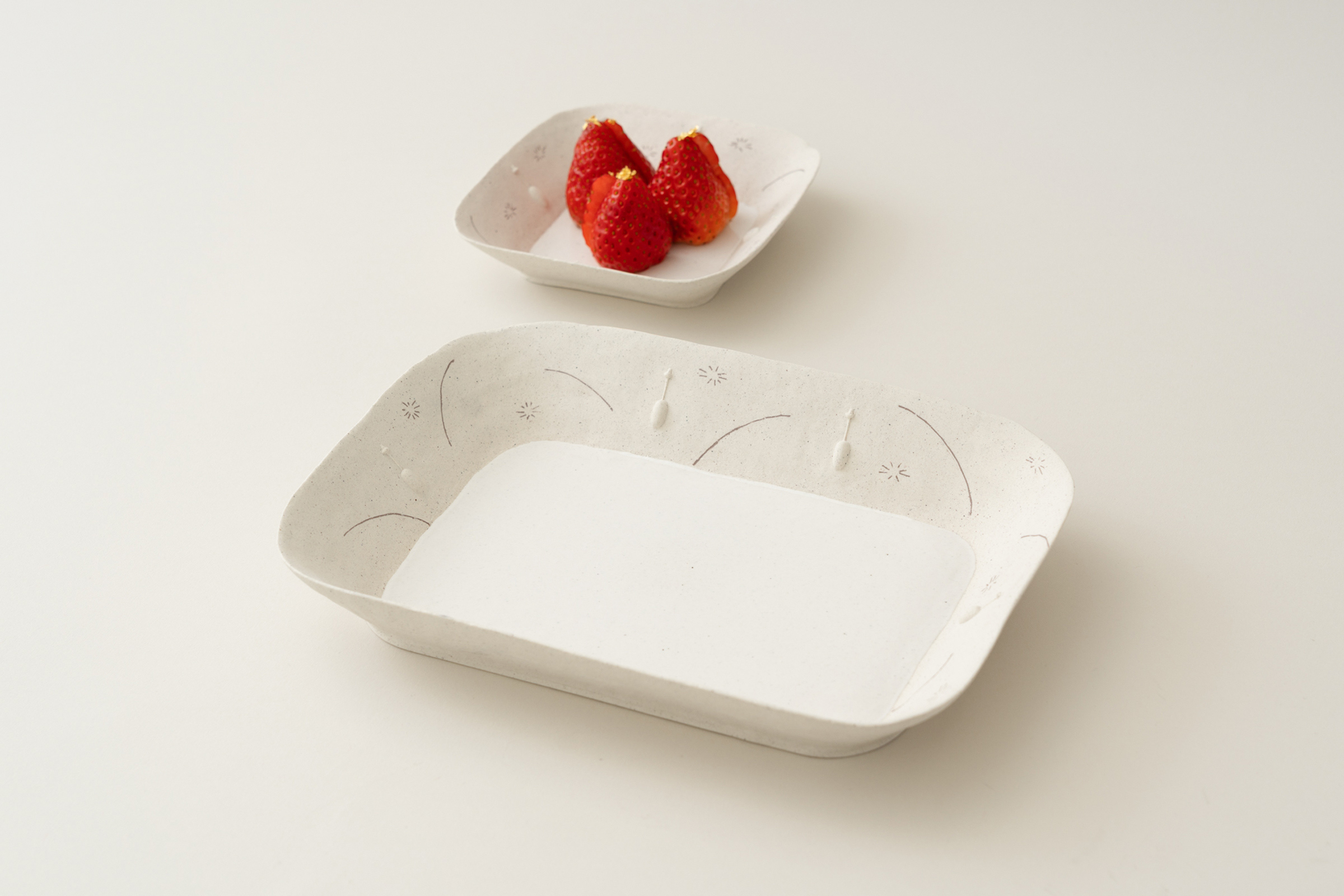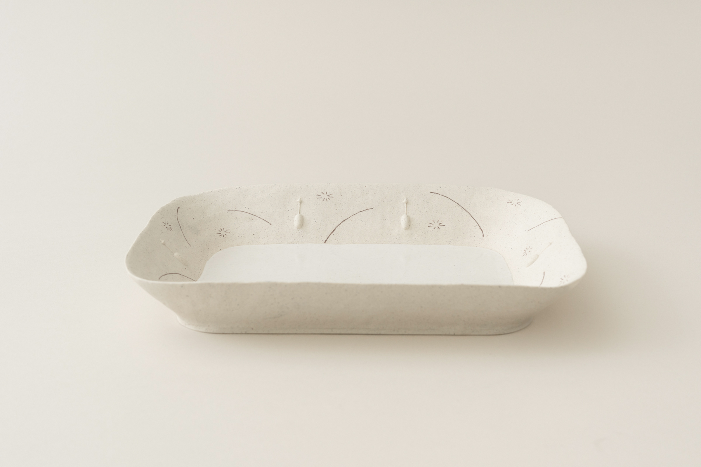 넉넉한 크기의 둥근 직사각형 모양의 플레이트로, 과일 혹은 다과 등을 담기 좋은 크기입니다. 산수유의 우산이 갈라지듯 피어내는 산수유의 꽃, 꽃이 지면 잎과 함께 나오는 어린 산수유 열매도 양각의 패턴으로 담았습니다. |