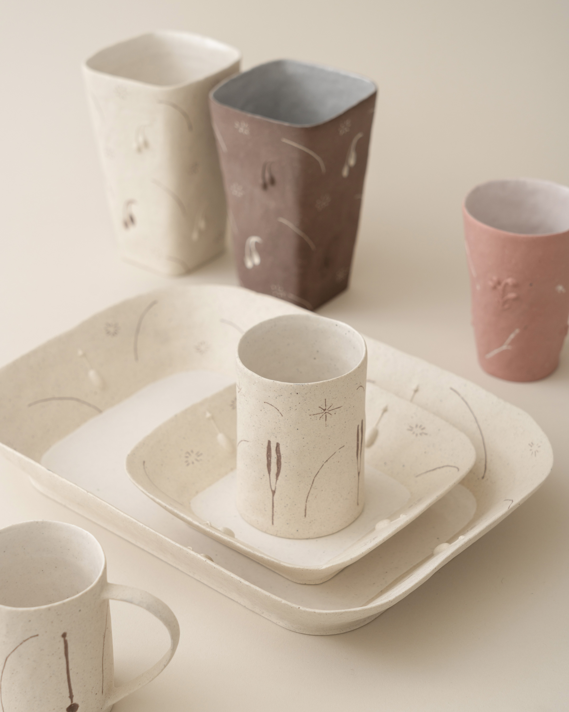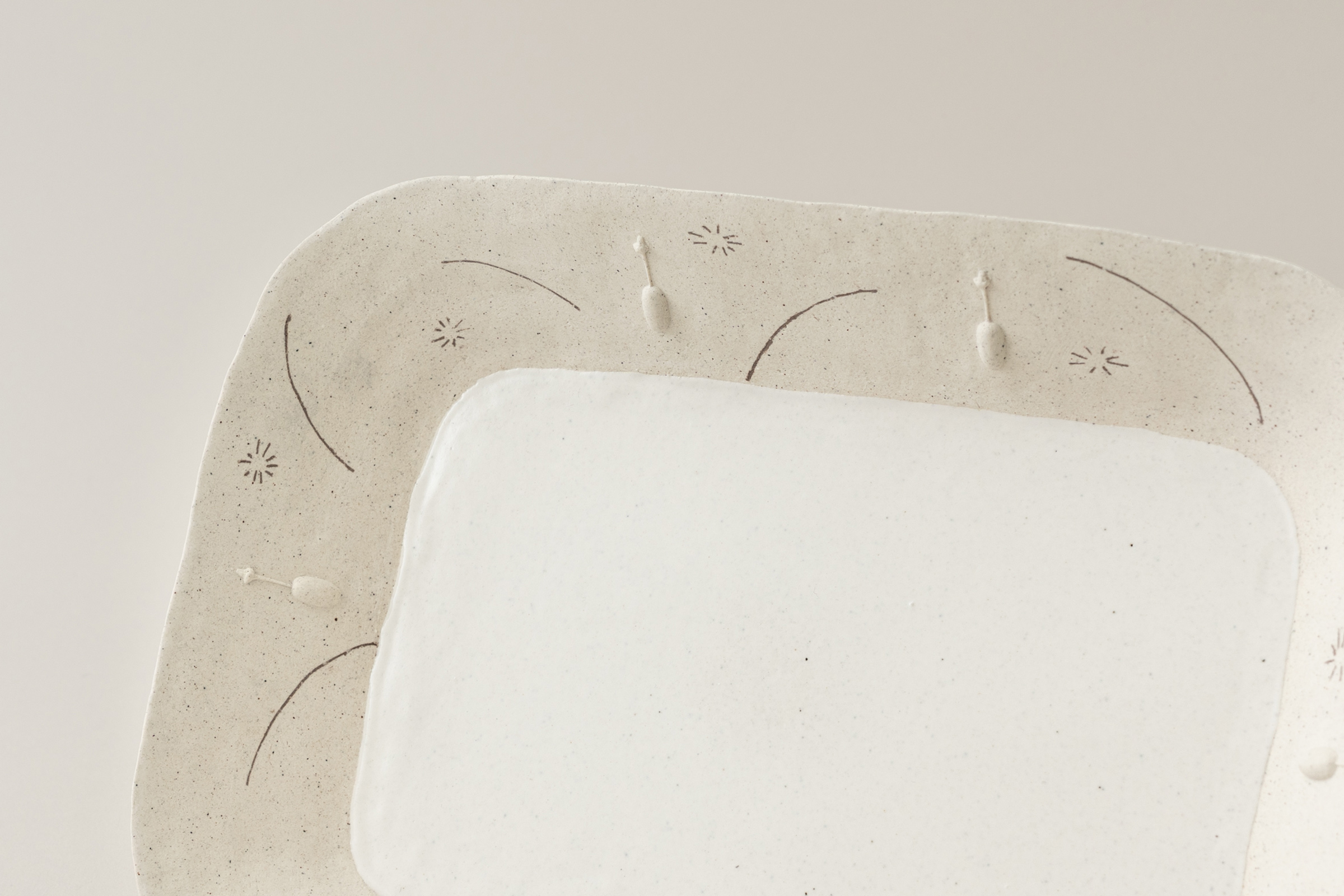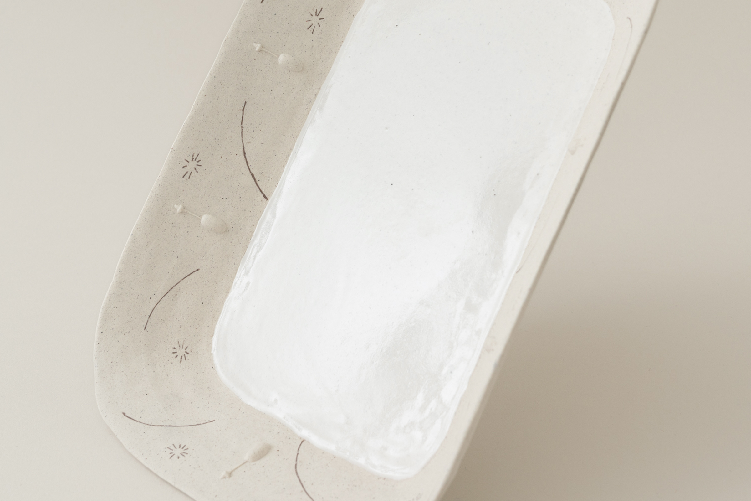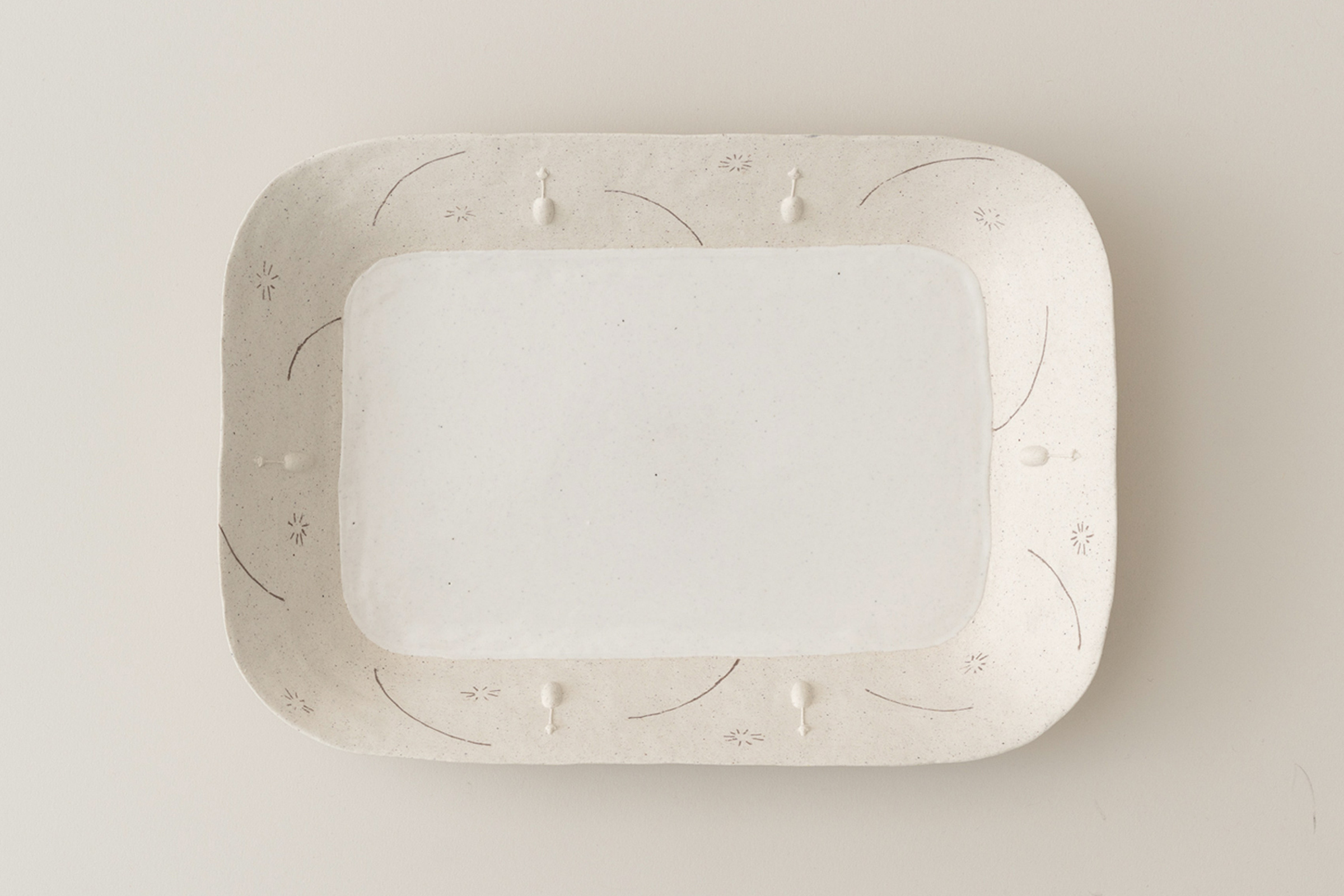 식물의 모습을 모티프로 기물을 만드는〈안민주〉작가의 〈봄의 소식 플레이트 L〉를 소개합니다. 따스한 나날의 시작을 먼저 알려오는 산수유를 담은 둥근 직사각형 모양의 플레이트입니다. |