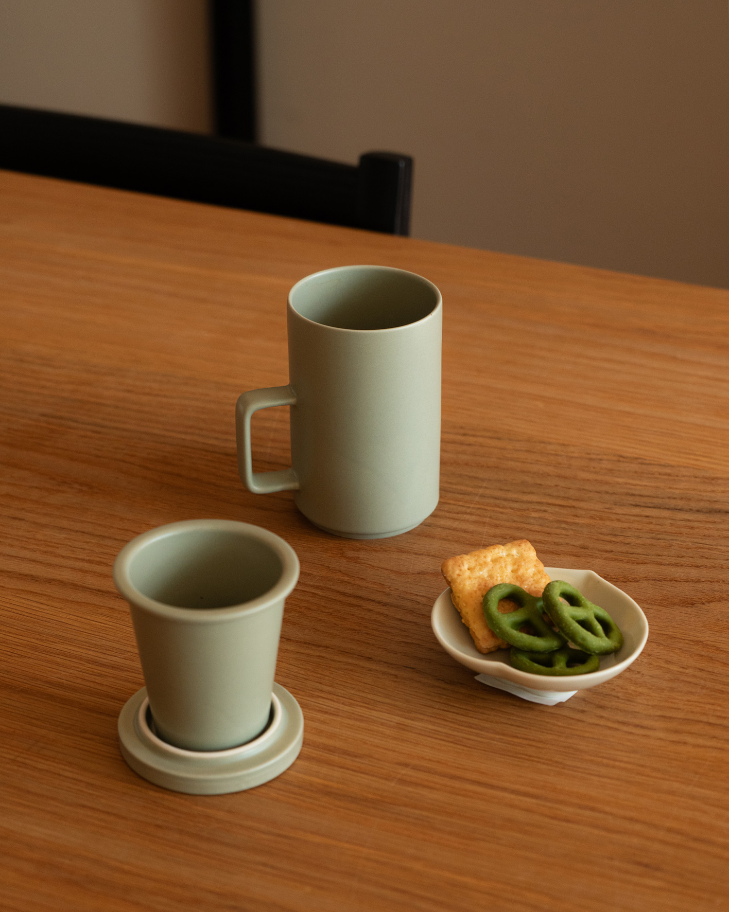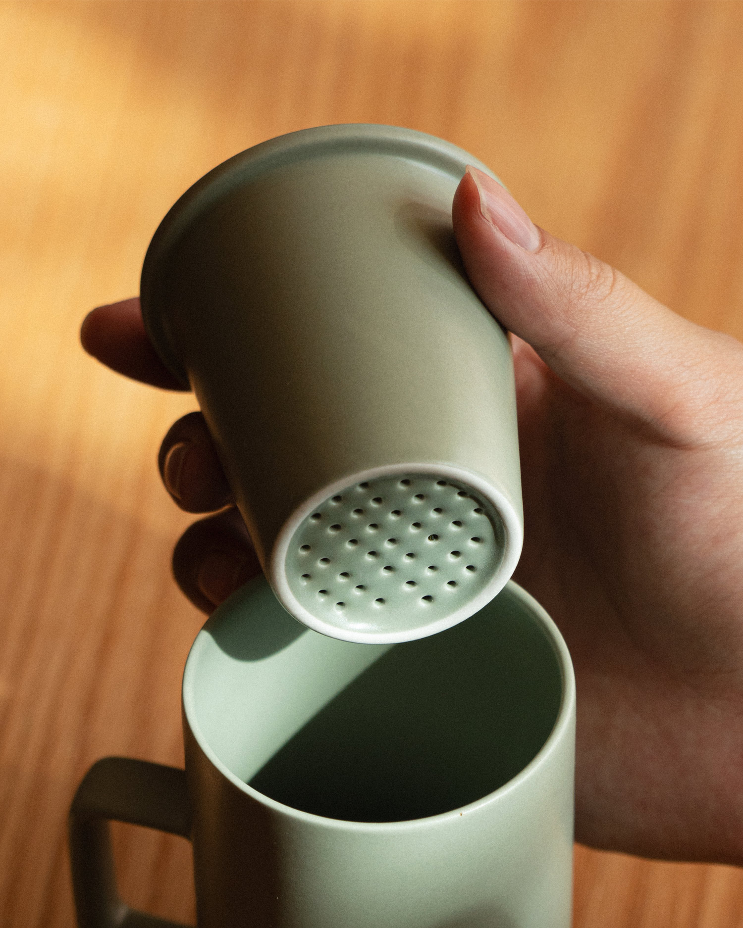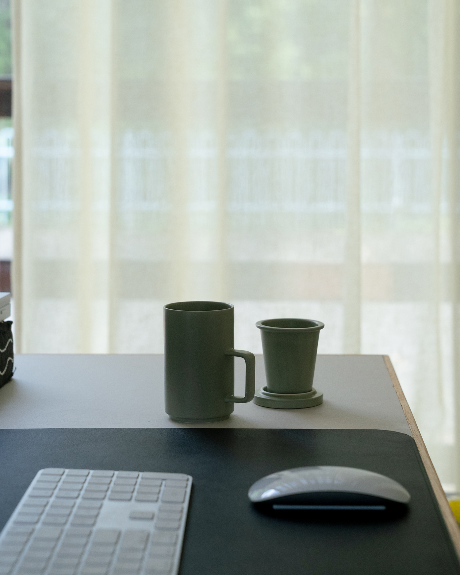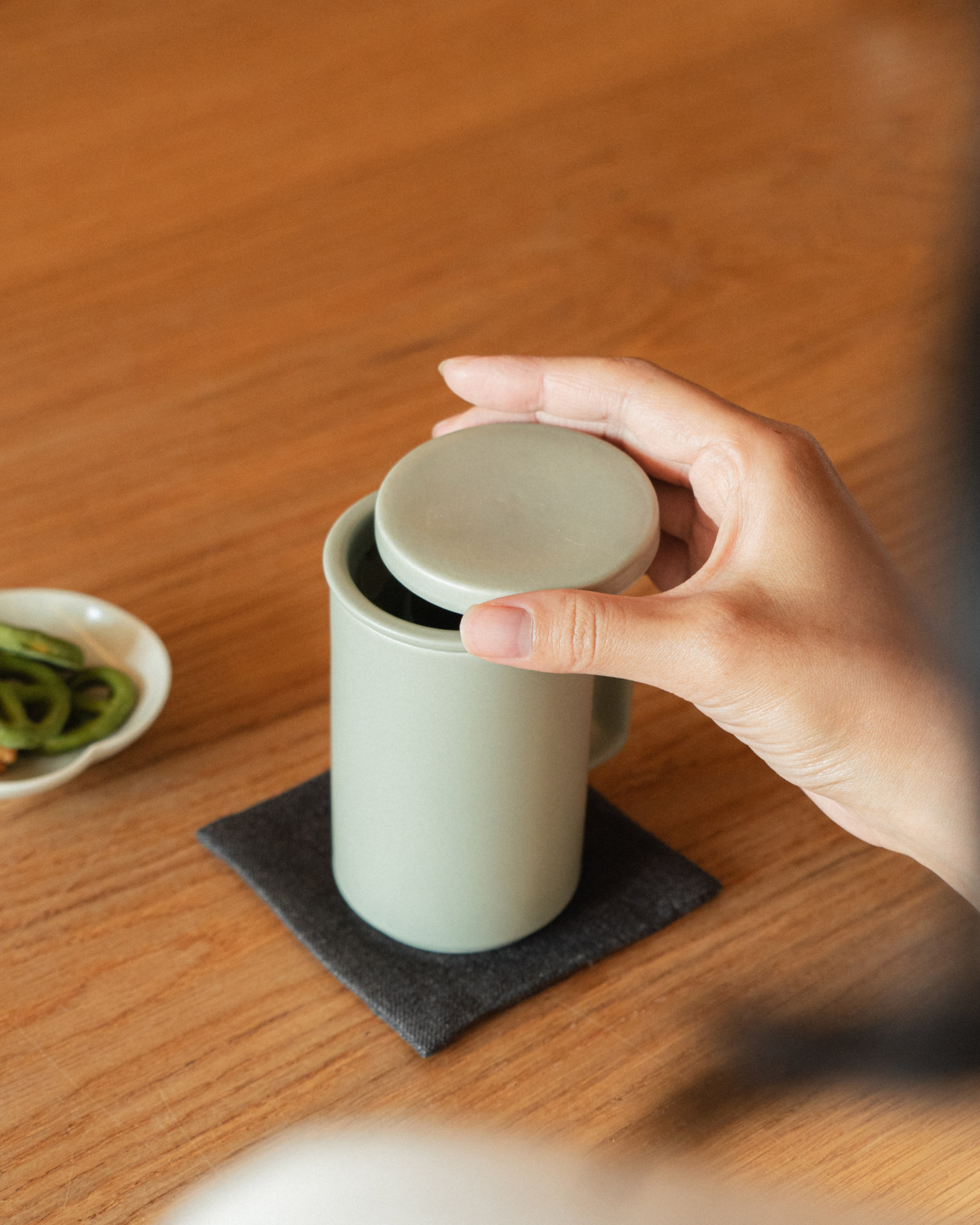 뚜껑은 거름망을 올려둘 받침으로도 활용할 수 있어 간편합니다. 은은한 세이지 그린 컬러는 어떤 공간에도 자연스럽게 스며든답니다. 만수 기준으로 200ml의 용량이지만, 사용해 보니 거름망과 함께 차를 우리며 사용할 때는 180ml 이하의 용량이 적절한 것 같아요. 차를 마시지 않을 때에는 머그만 따로 사용하기에도 좋습니다. |