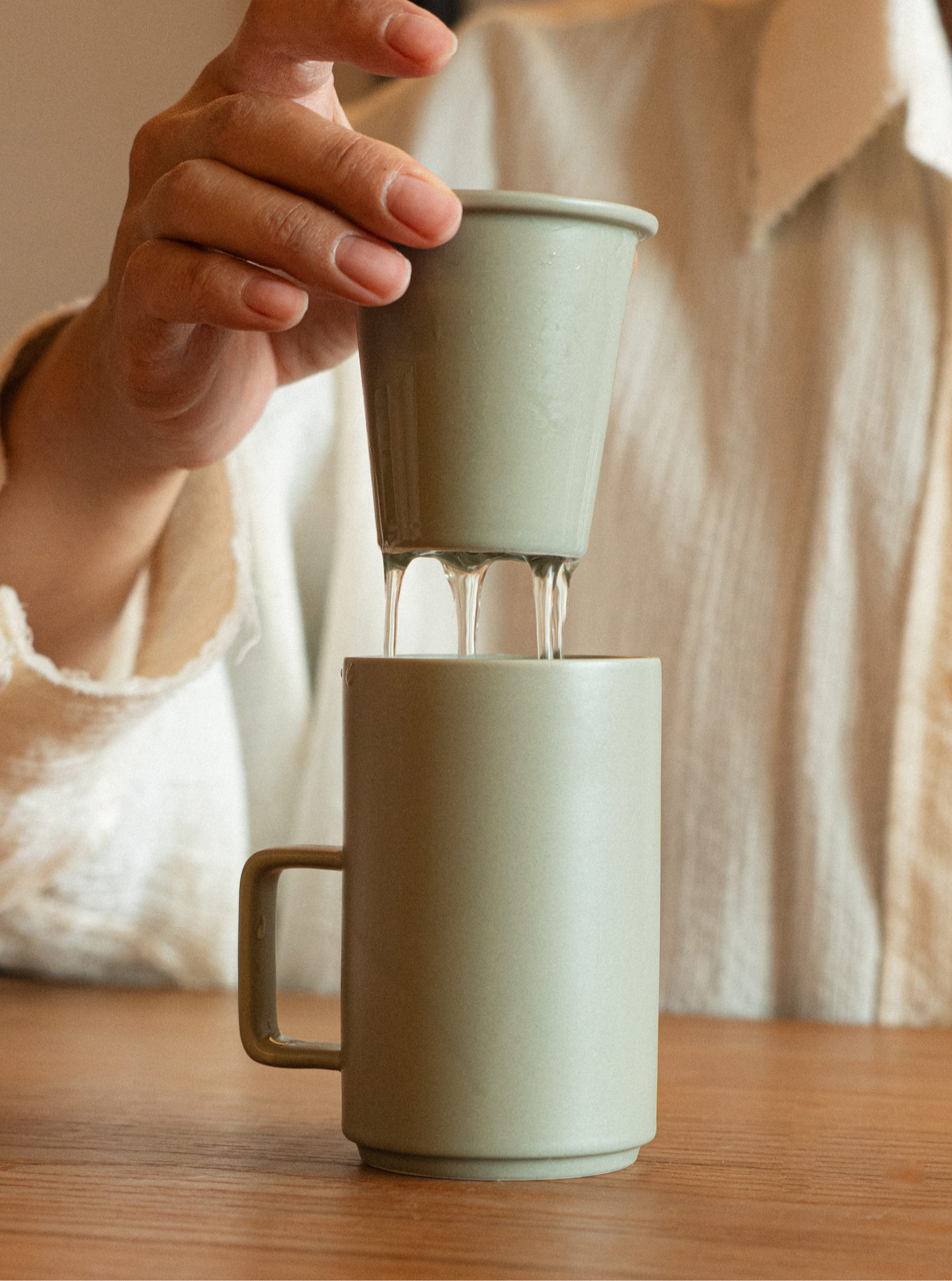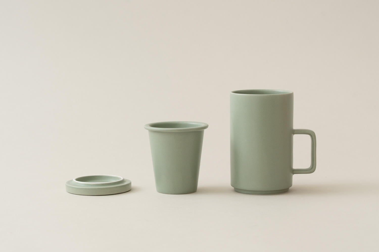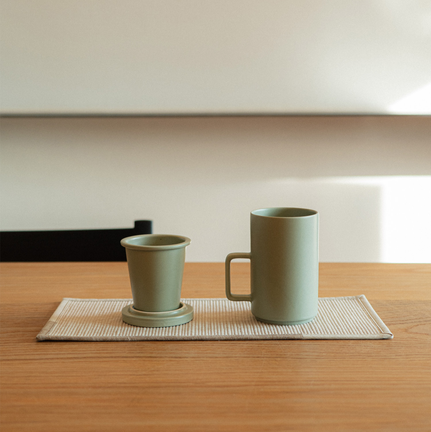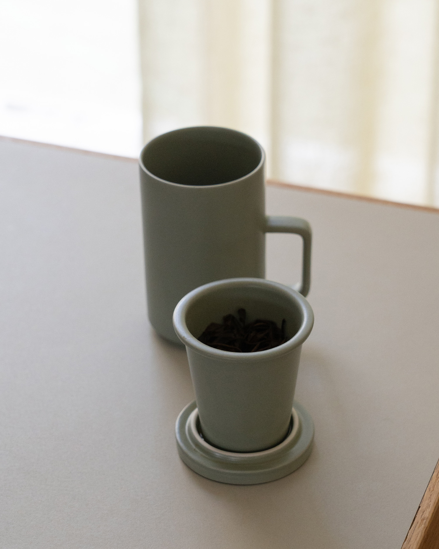 뚜껑은 거름망을 올려둘 받침으로도 활용할 수 있어 간편합니다. 은은한 세이지 그린 컬러는 어떤 공간에도 자연스럽게 스며든답니다. 만수 기준으로 200ml의 용량이지만, 사용해 보니 거름망과 함께 차를 우리며 사용할 때는 180ml 이하의 용량이 적절한 것 같아요. 차를 마시지 않을 때에는 머그만 따로 사용하기에도 좋습니다. |