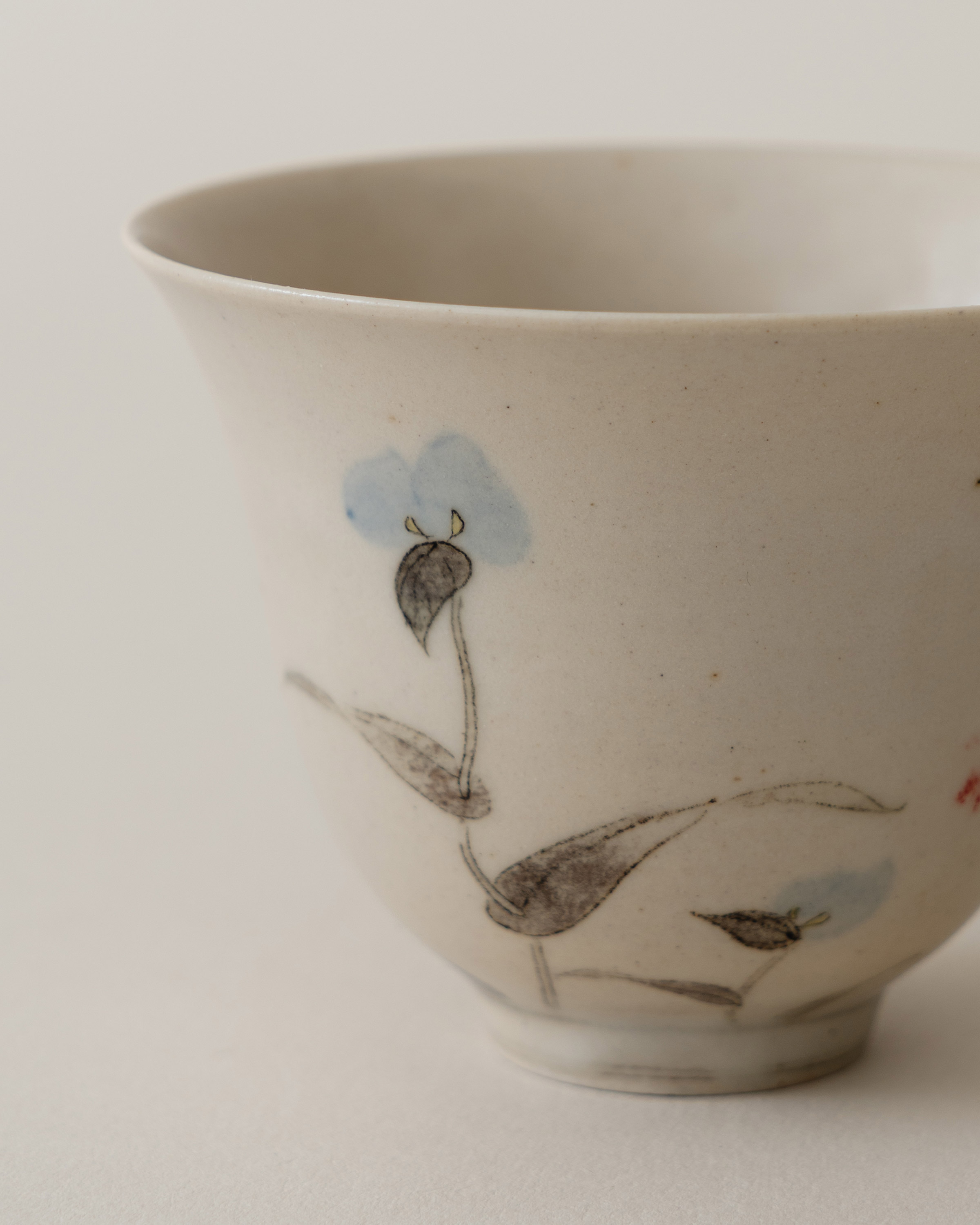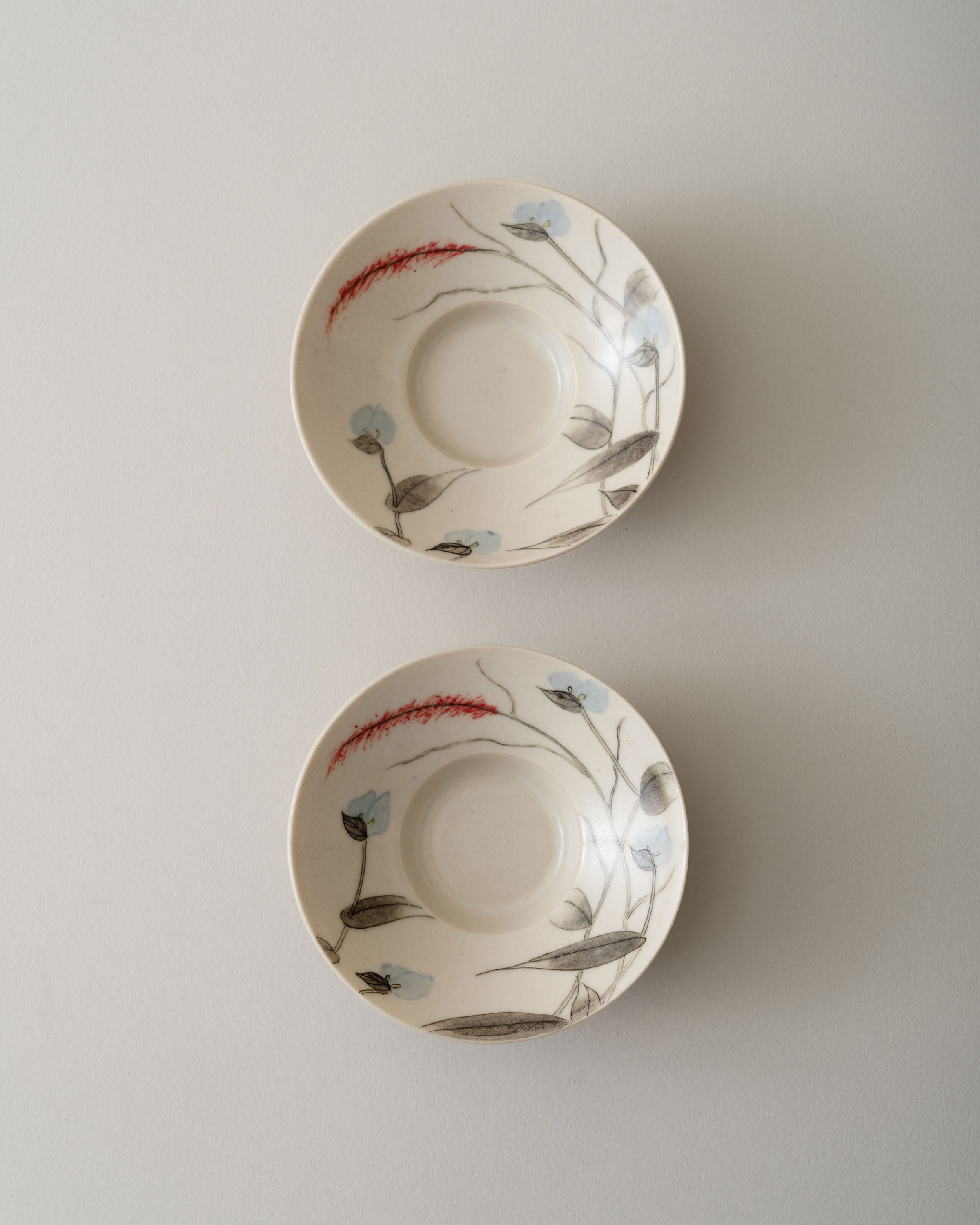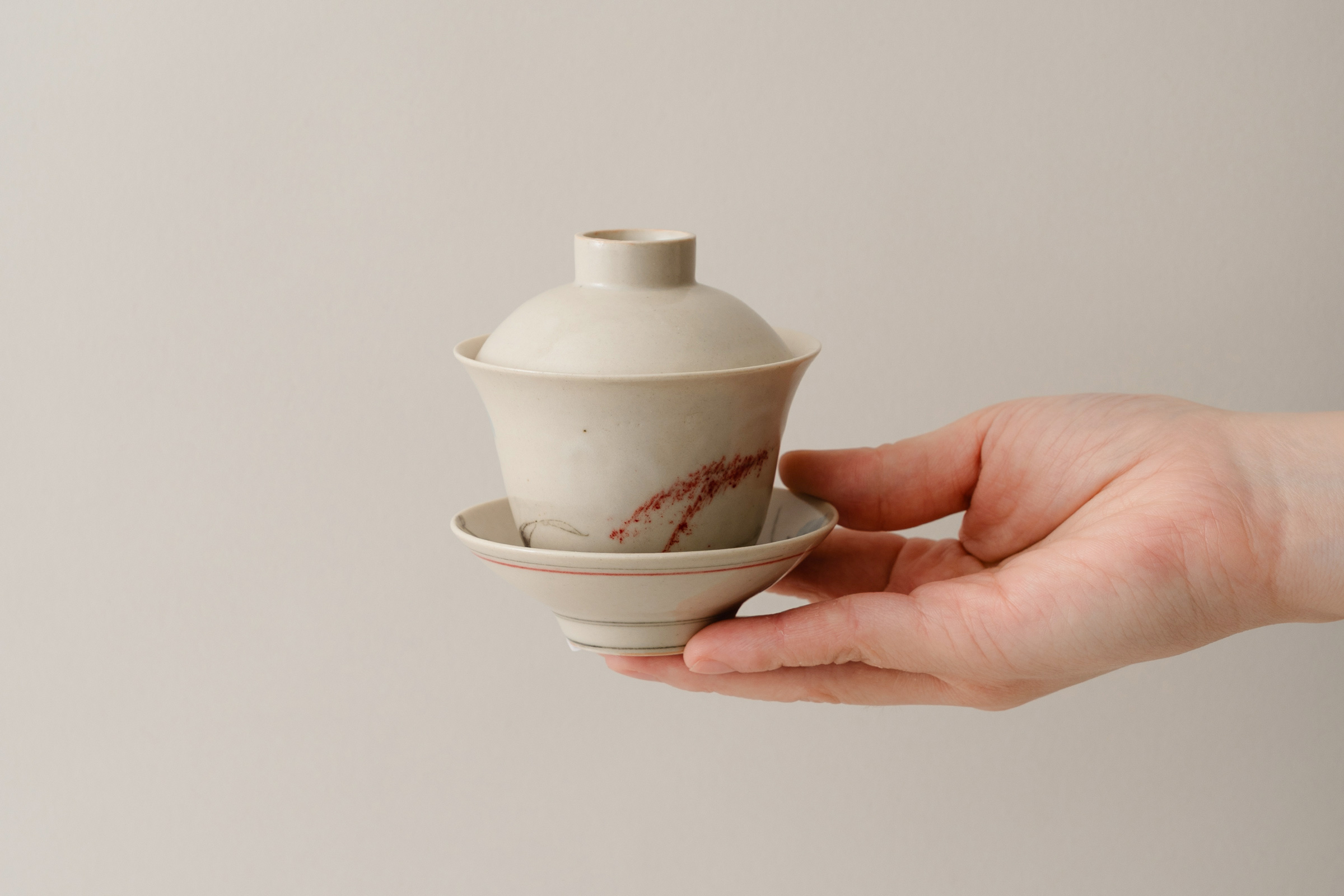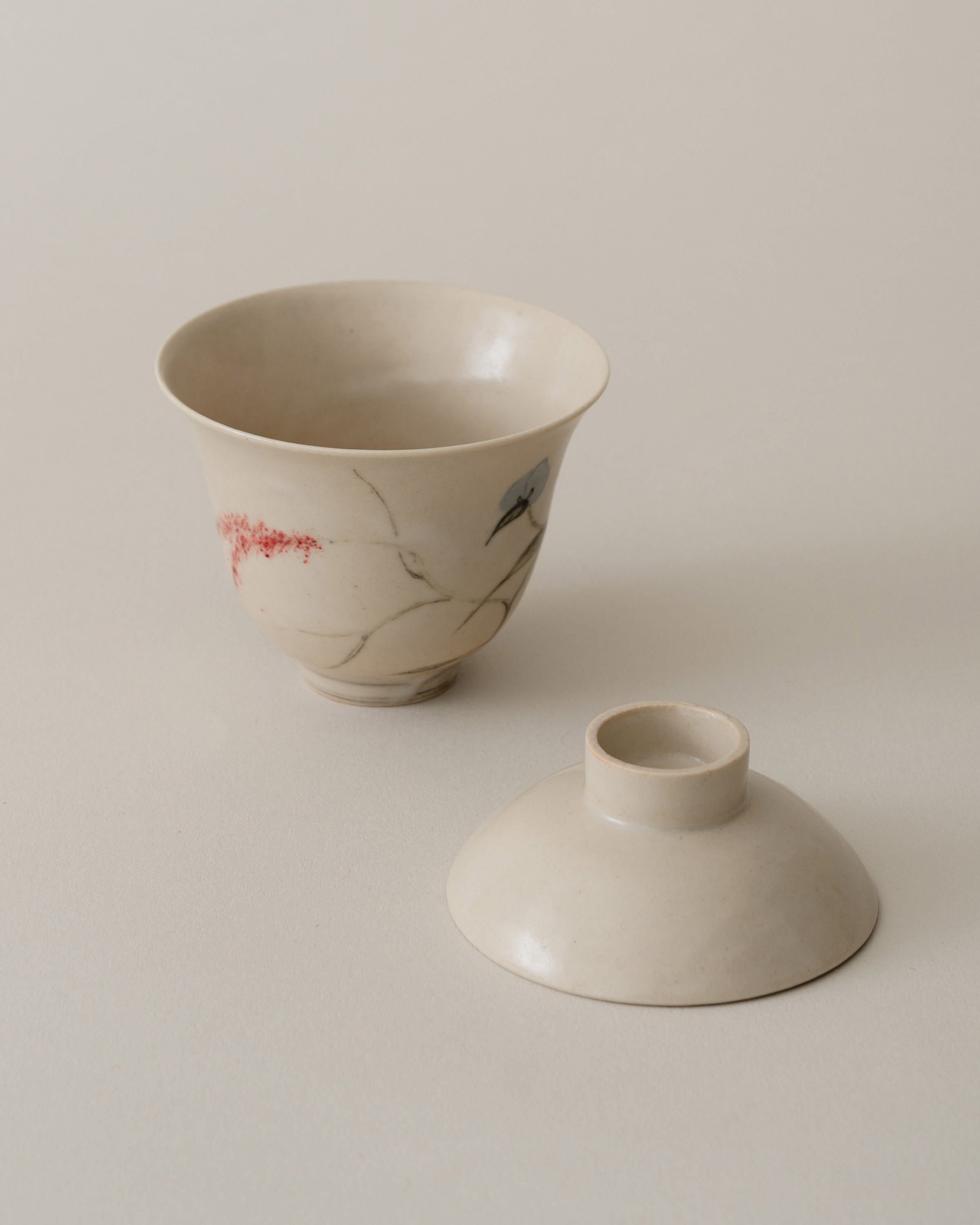 겸재 정선의 달개비 그림을 그려 넣은 개완으로, 차분한 바탕 위에 더한 붉은 안료가 담백한 생기를 불어넣어 줍니다. 만수 기준 95ml 용량으로 1인분의 차를 우리기에 알맞습니다. 개완의 본래 쓰임처럼 차를 따라내거나, 넉넉한 하나의 찻잔으로 즐기기에도 좋습니다.