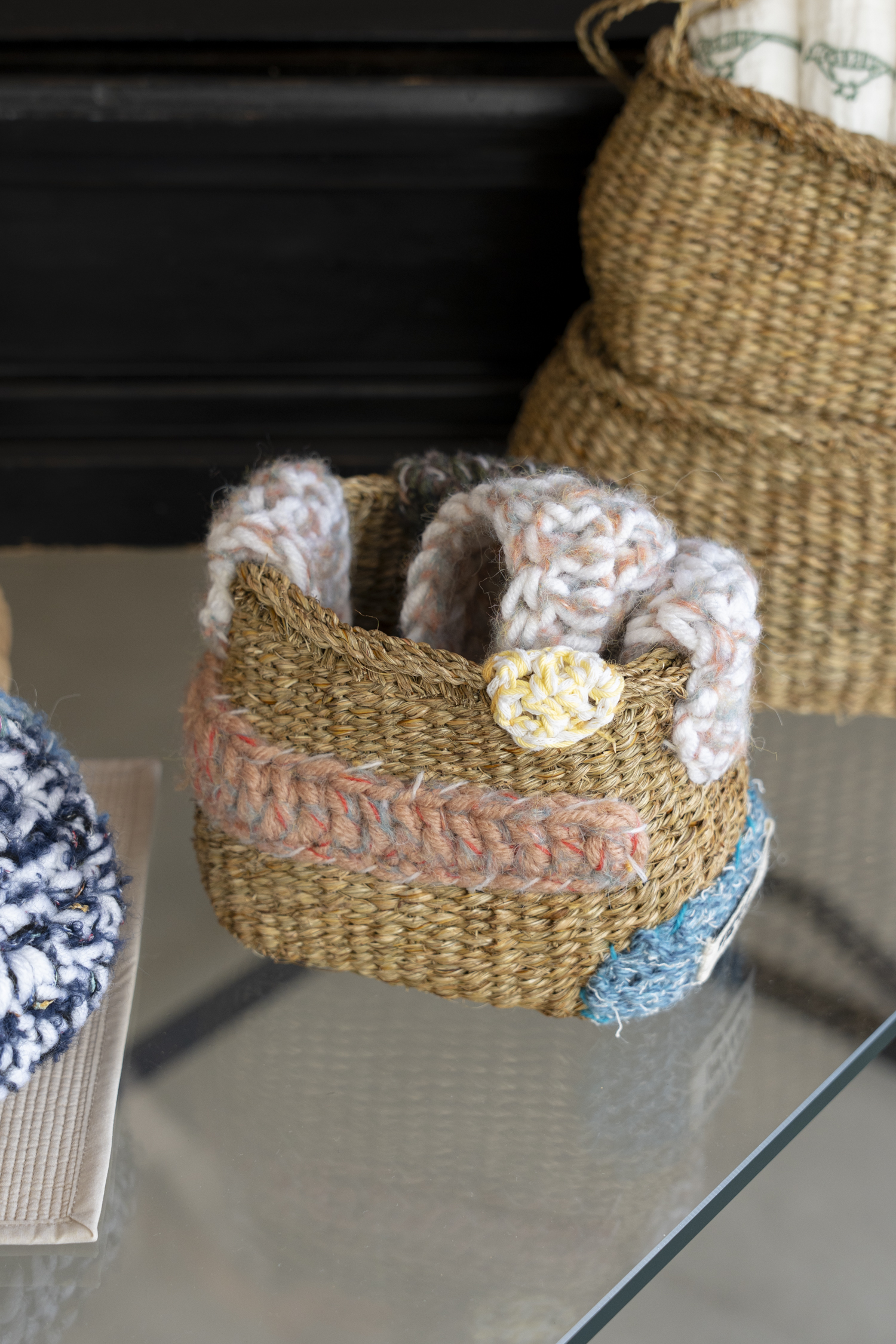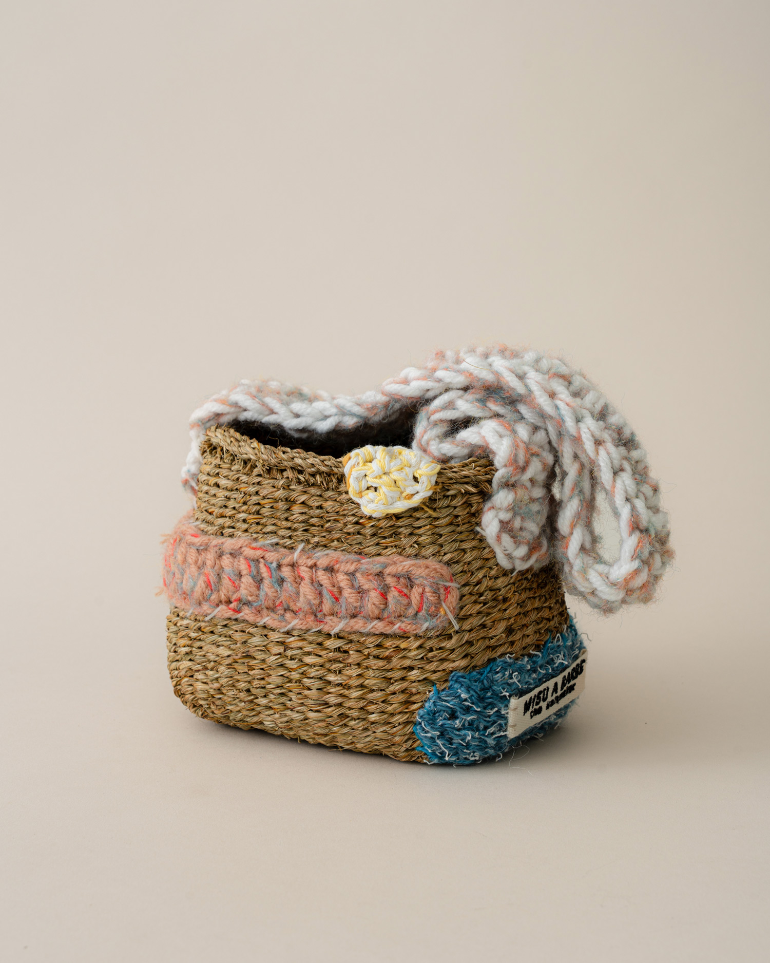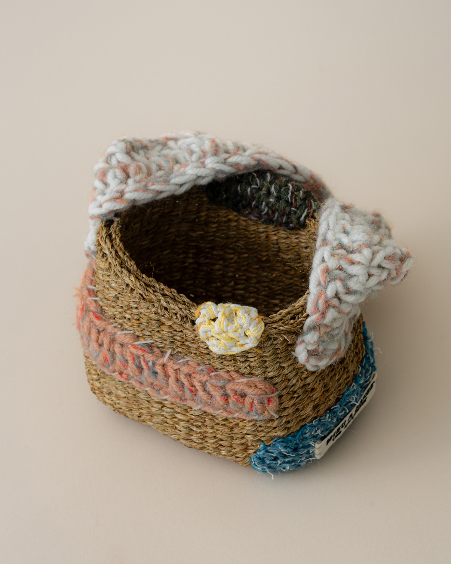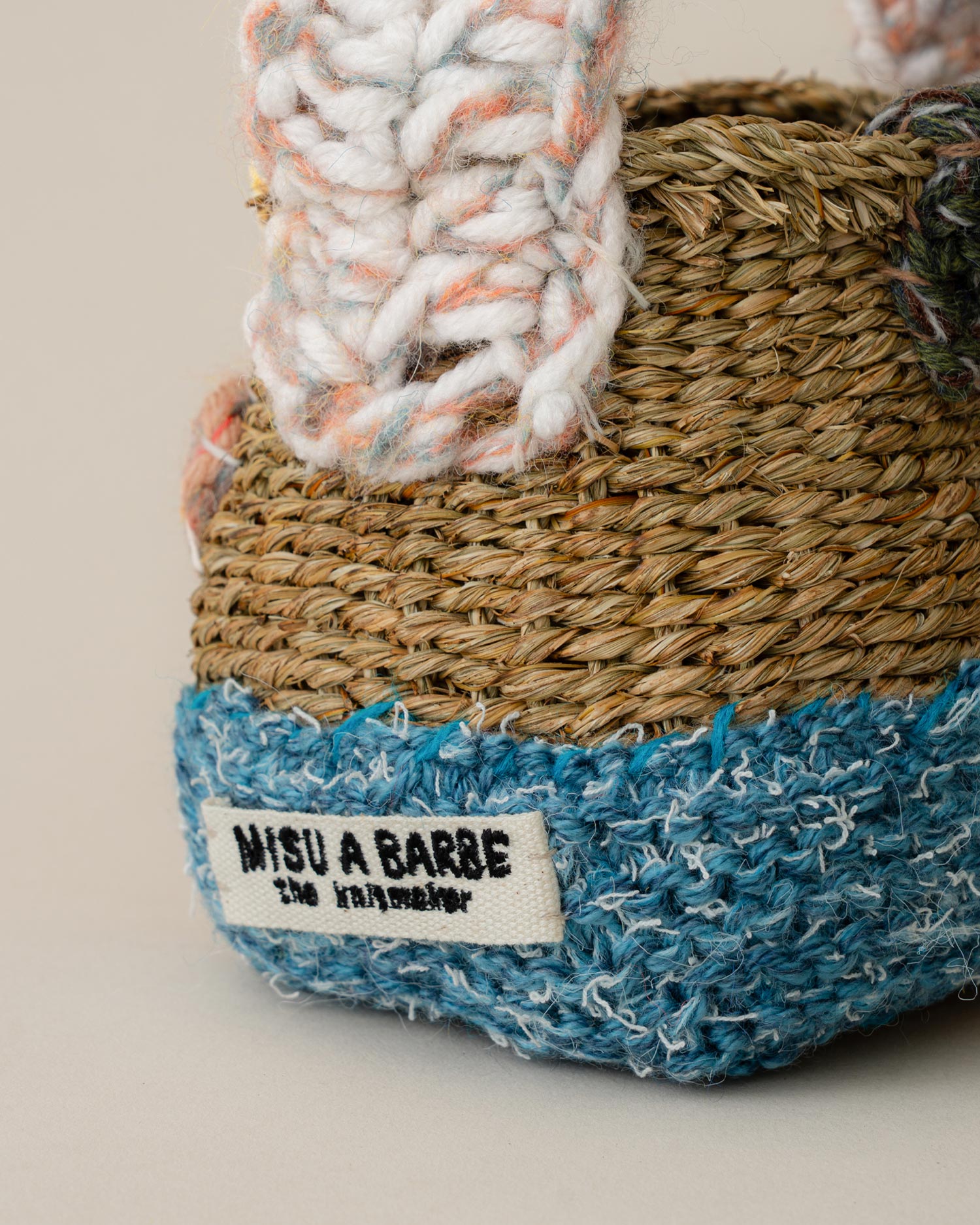 짚풀공예가 강문실 작가의 바구니에, 니트를 중심으로 다양한 가능성을 탐구하는 〈MISU A BARBE〉의 니팅을 더한 〈제주 신서란 바구니 S〉를 소개합니다.