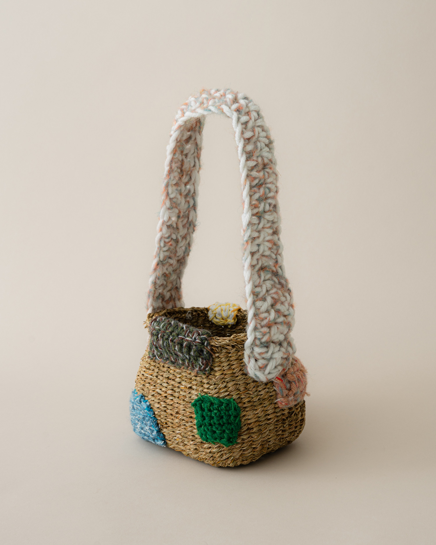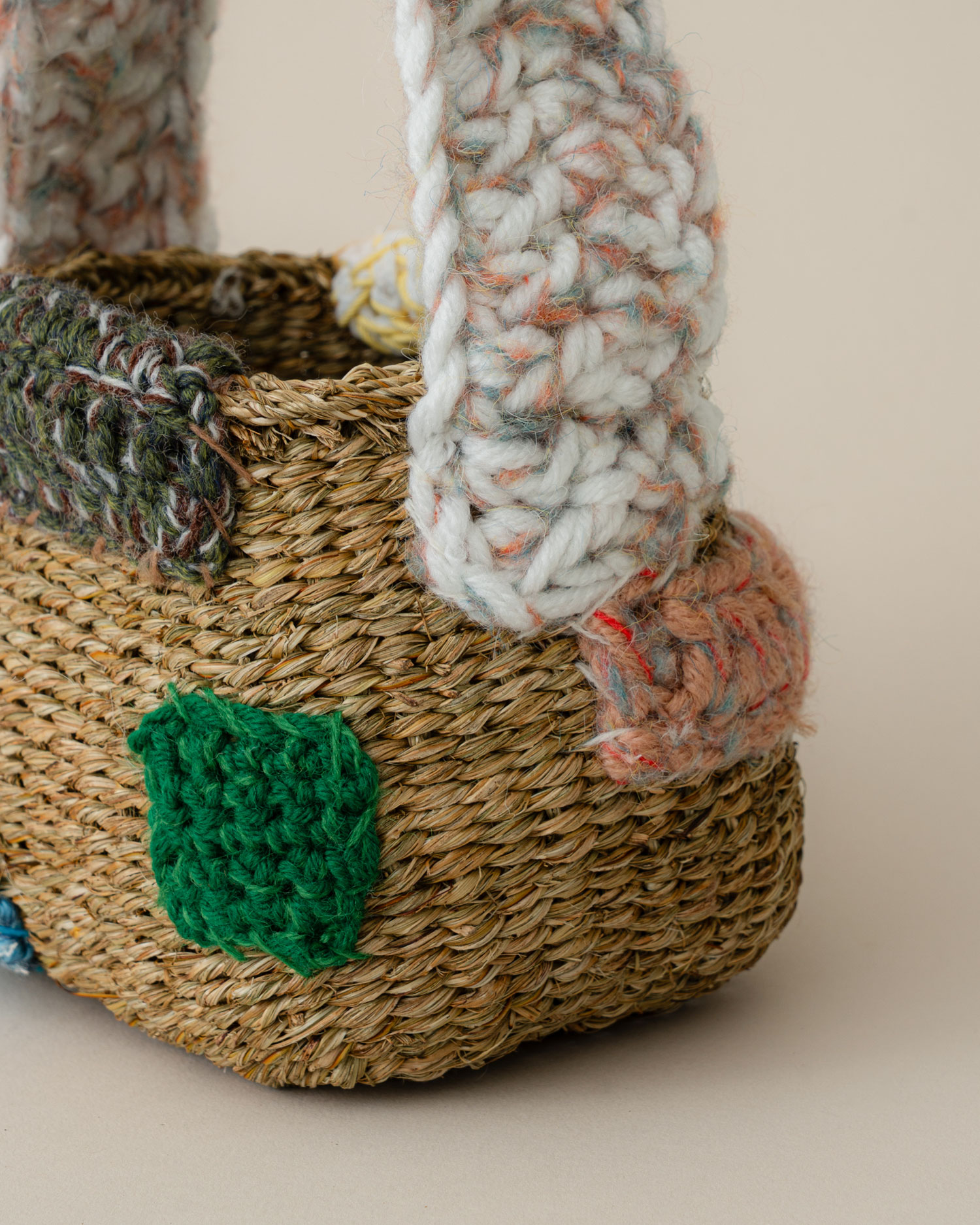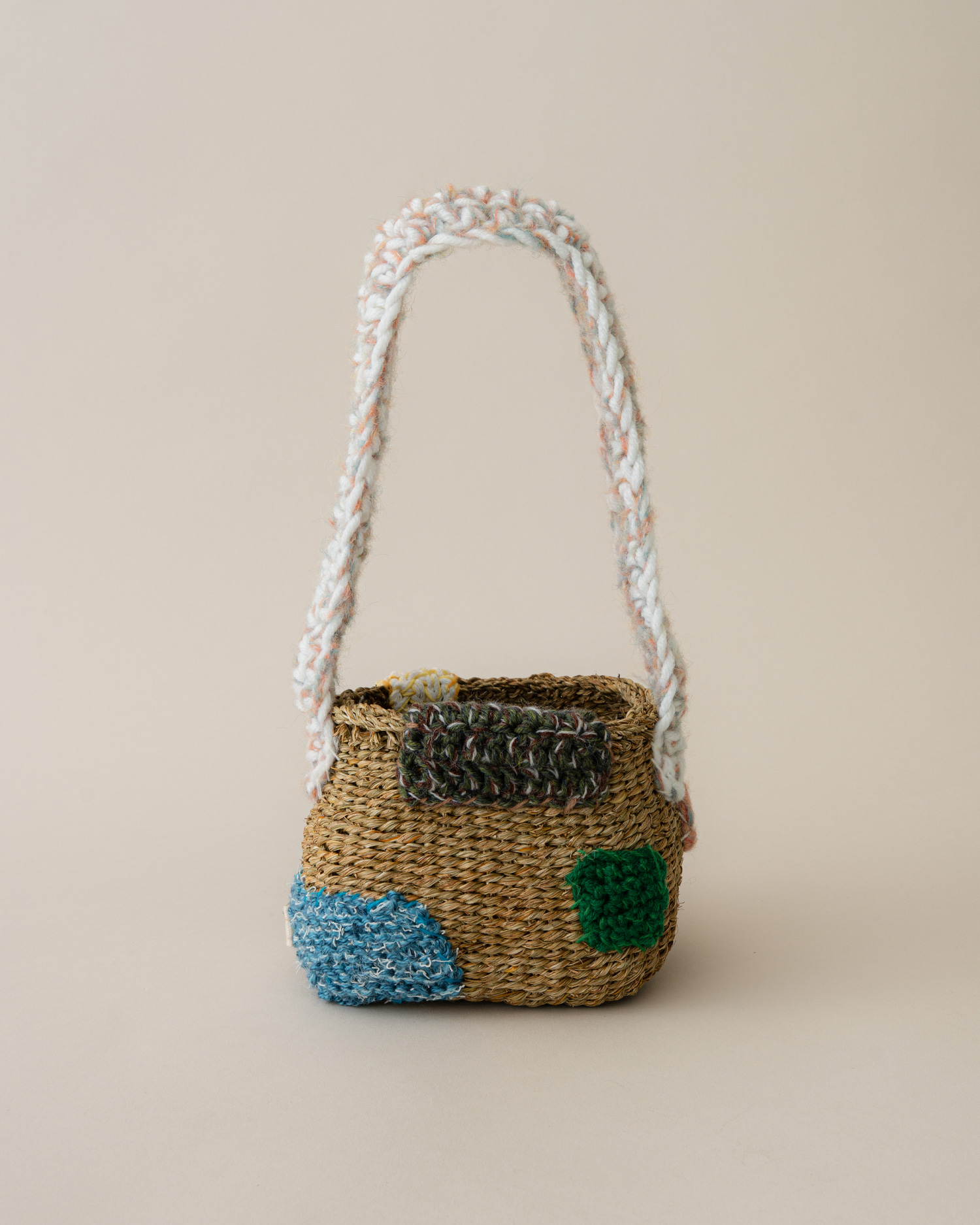 신서란은 제주에서만 자생하는 풀로, 과거에는 돌담 주변에서 흔히 볼 수 있었지만 지금은 보기 드문 식물입니다. 채취한 뒤 그늘에서 말리고, 두드려 섬유질을 고르게 쪼갠 다음 새끼줄을 꼬아 바구니를 엮는 전통 방식으로 만들어집니다. 이렇게 완성된 바구니에 미수아바흐브의 발랄한 니트 패치를 더했습니다. 다양한 색과 질감의 니트 패치를 덧대어 하나의 바구니에서 여러 표정이 공존하는 것이 특징입니다.