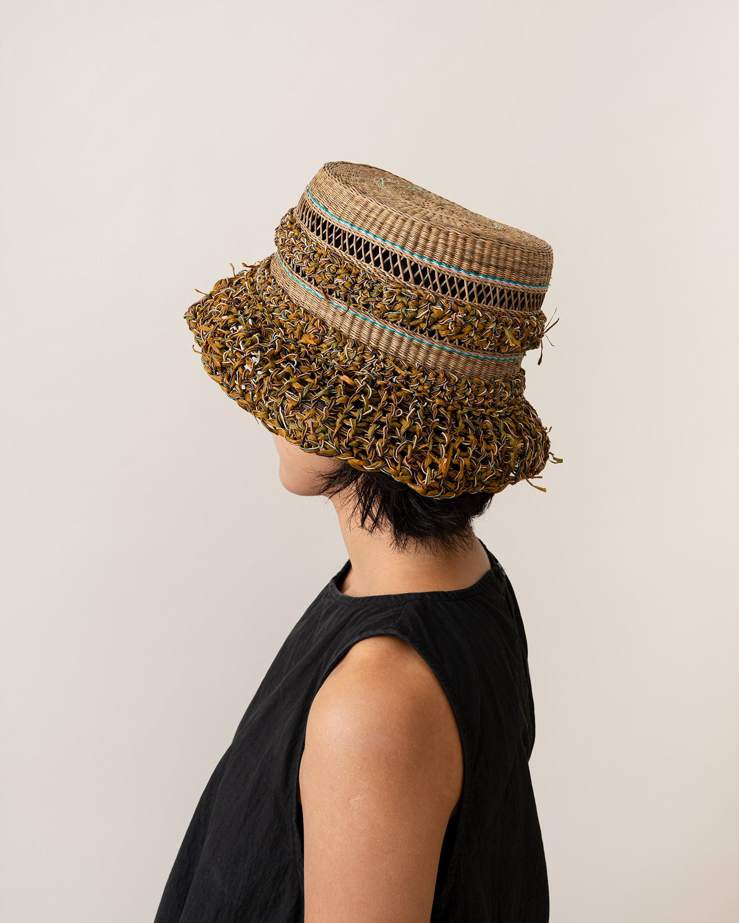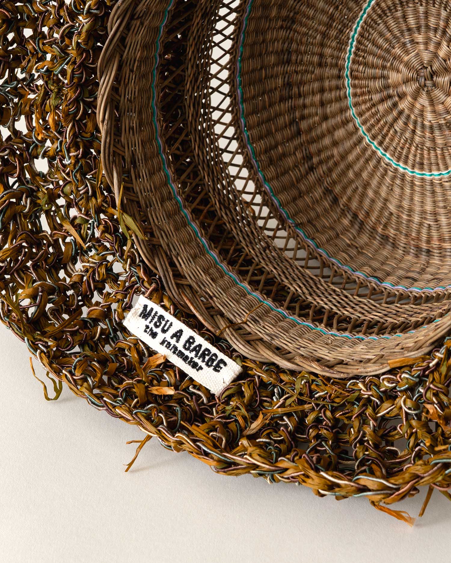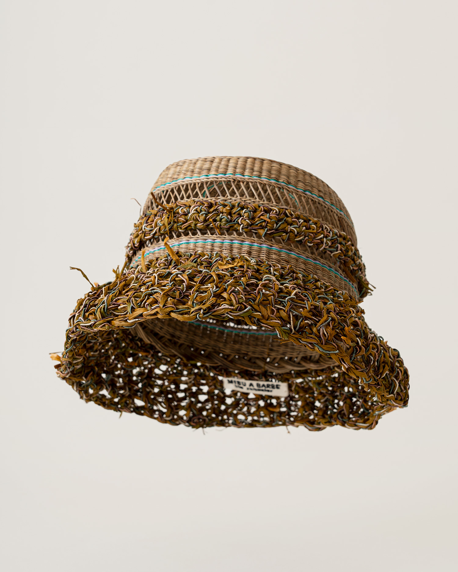 정동벌립은 제주에서 정동이라 불리는 댕댕이 덩굴로 엮어 만든 전통 모자입니다. 미수아바흐브는 장인이 완성한 정동벌립에 니트 작업을 더해 산뜻한 매력을 지닌 모자를 완성했습니다. 코바늘과 대바늘을 사용해 챙 부분을 짜 장식하고, 라피아를 한줄 한줄 엮어낸 이음새를 그대로 드러내 자연스러운 소재감을 표현했습니다. 거칠지만 편안하고 독특한 멋을 즐길 수 있는 모자이자, 소장 가치 높은 오브제로 권해드립니다.