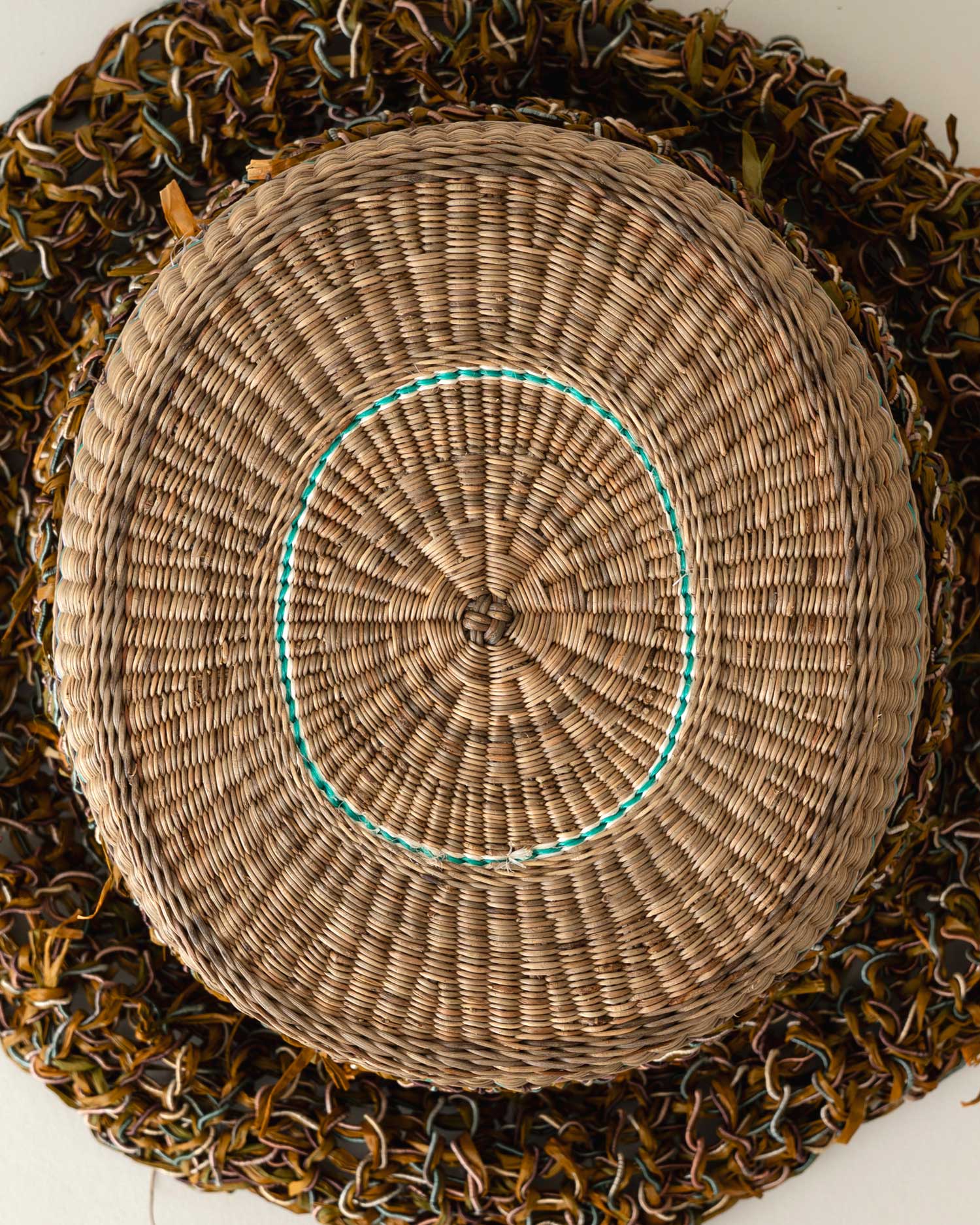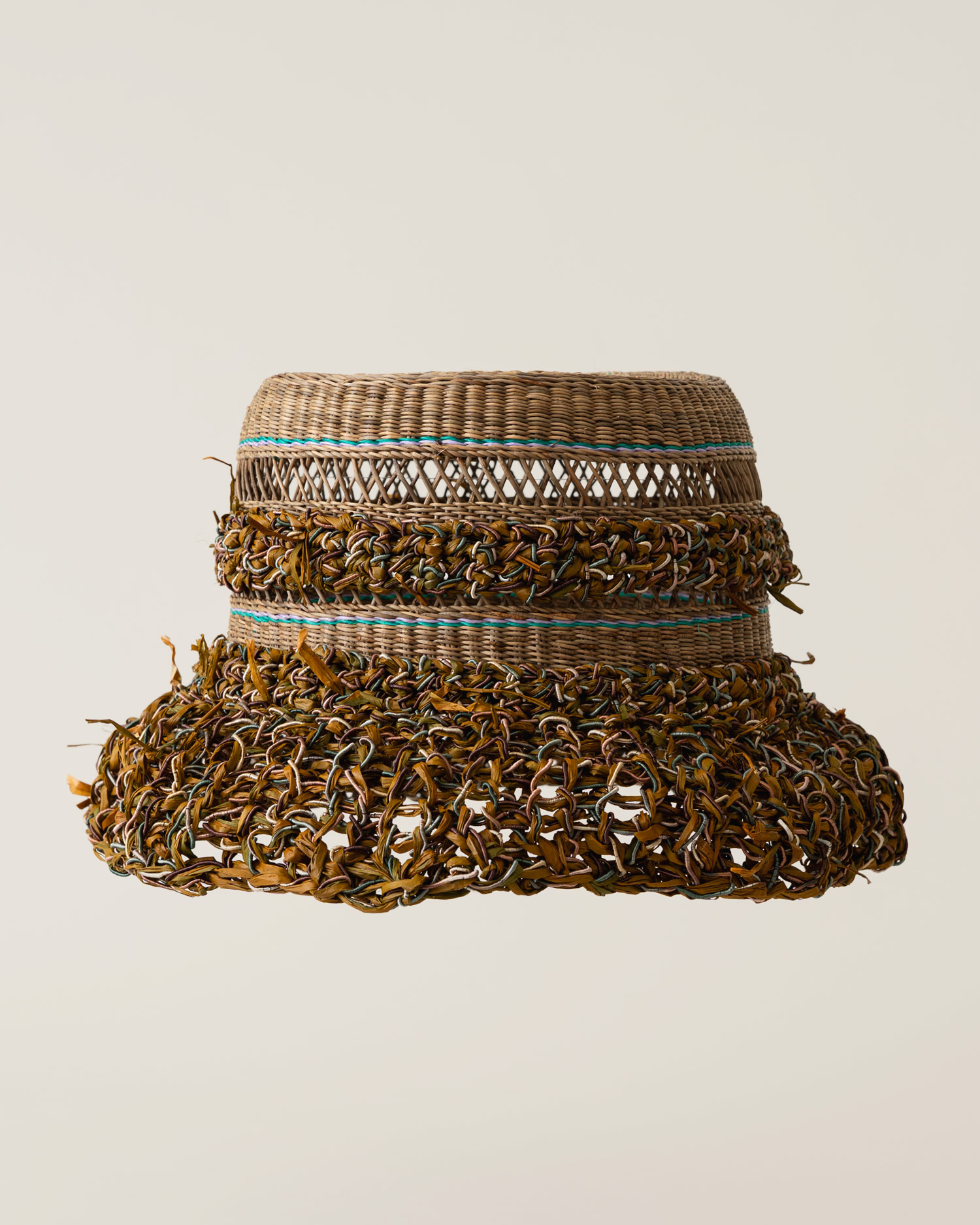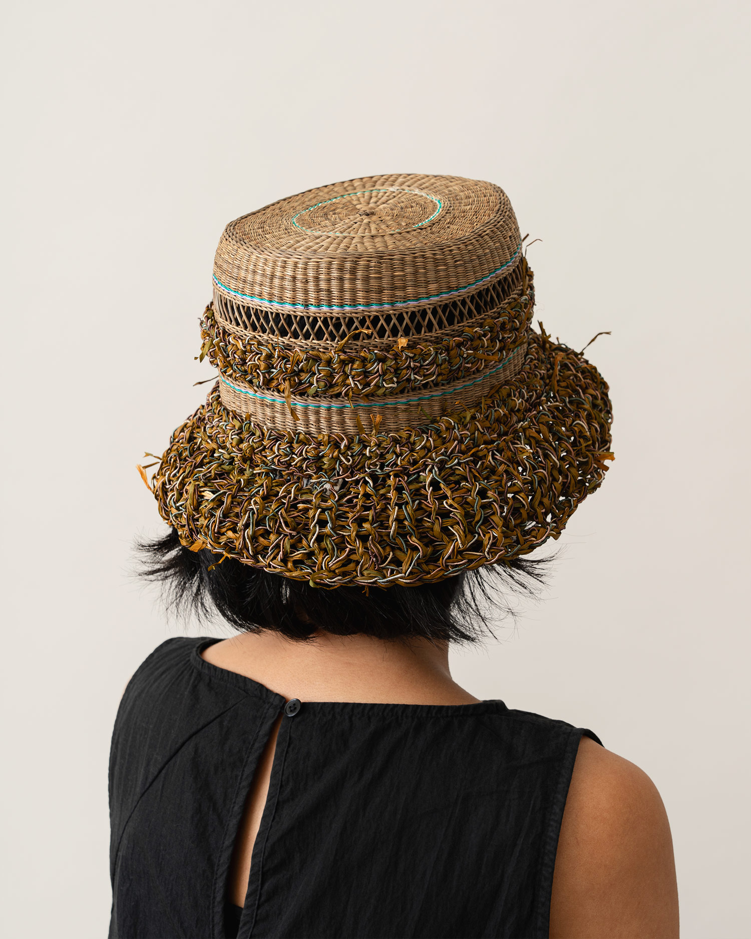 정동벌립은 제주에서 정동이라 불리는 댕댕이 덩굴로 엮어 만든 전통 모자입니다. 미수아바흐브는 장인이 완성한 정동벌립에 니트 작업을 더해 산뜻한 매력을 지닌 모자를 완성했습니다. 코바늘과 대바늘을 사용해 챙 부분을 짜 장식하고, 라피아를 한줄 한줄 엮어낸 이음새를 그대로 드러내 자연스러운 소재감을 표현했습니다. 거칠지만 편안하고 독특한 멋을 즐길 수 있는 모자이자, 소장 가치 높은 오브제로 권해드립니다.