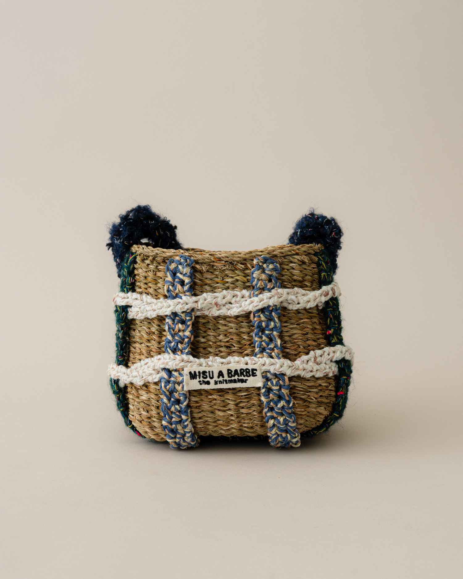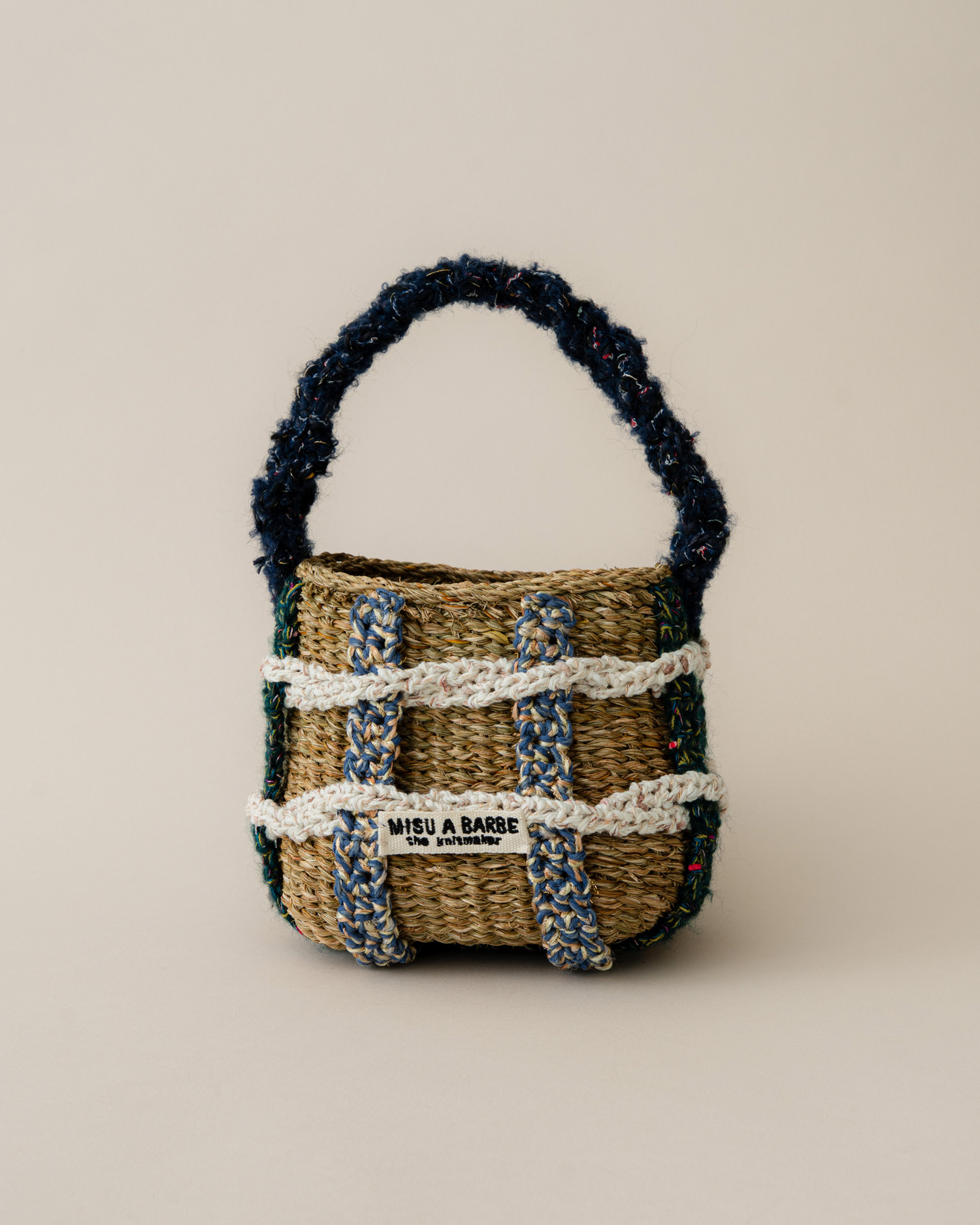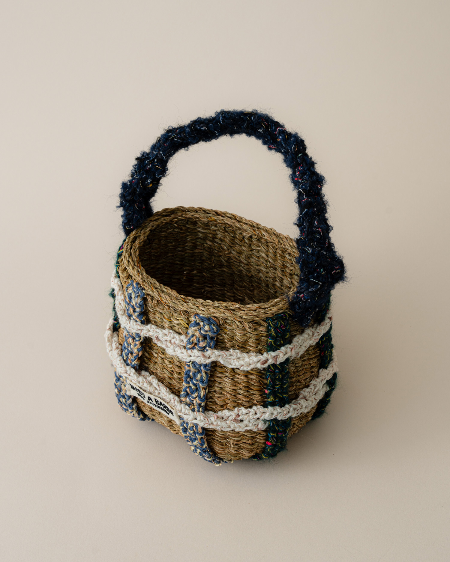 짚풀공예가 강문실 작가의 바구니에, 니트를 중심으로 다양한 가능성을 탐구하는 〈MISU A BARBE〉의 니팅을 더한 〈제주 신서란 바구니 M〉을 소개합니다.