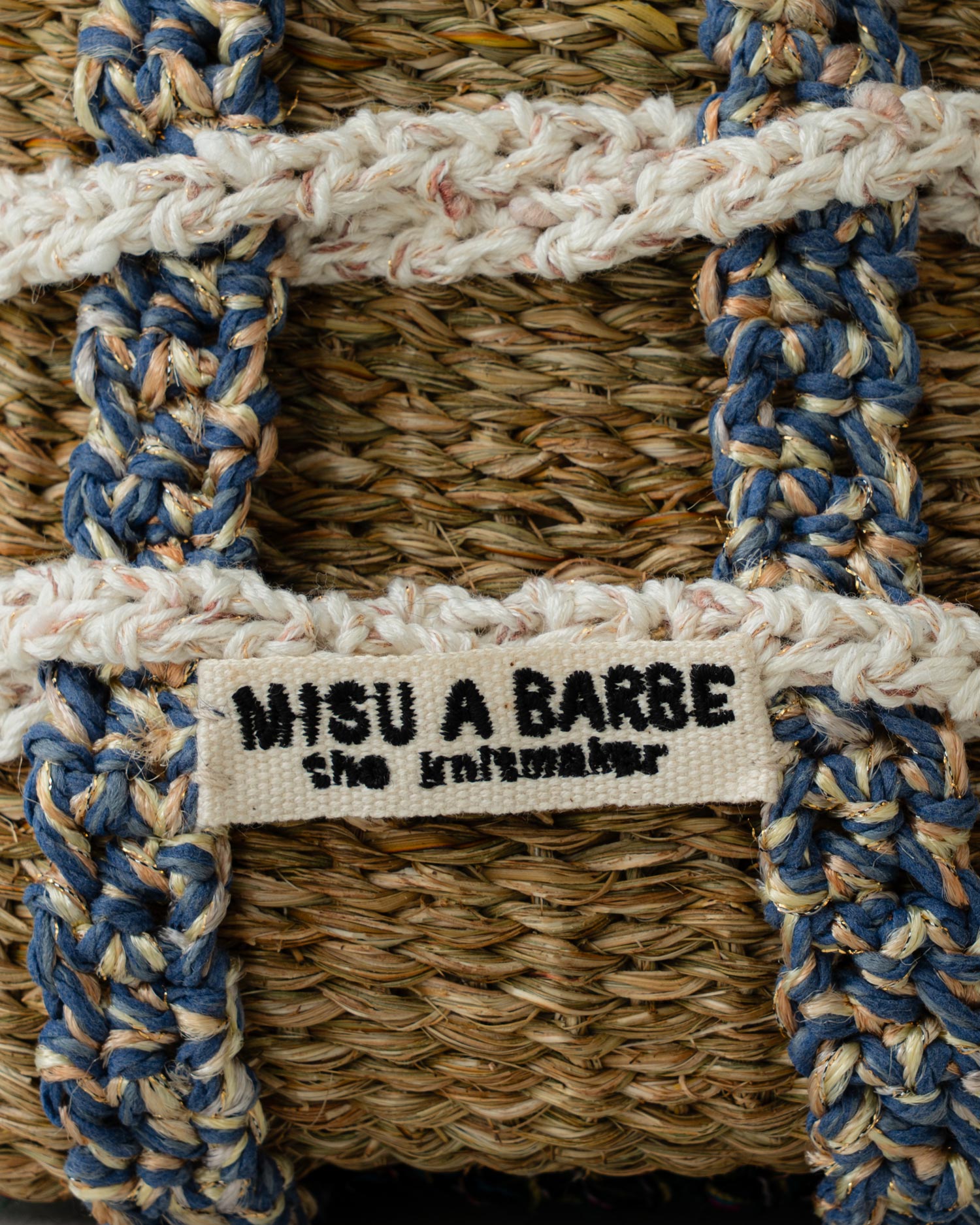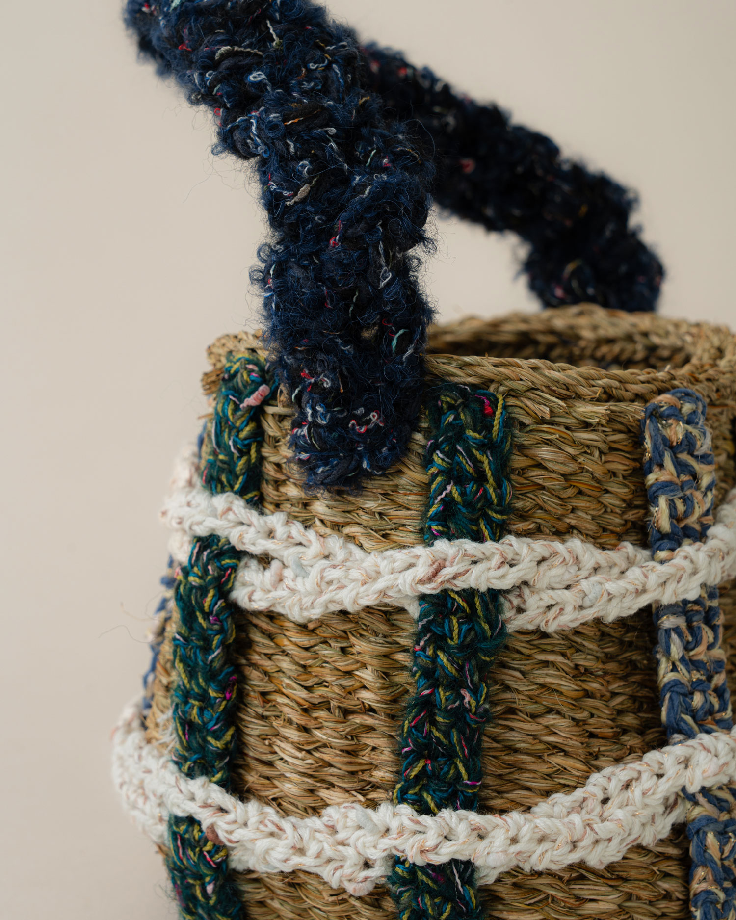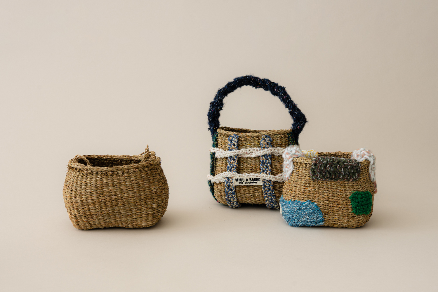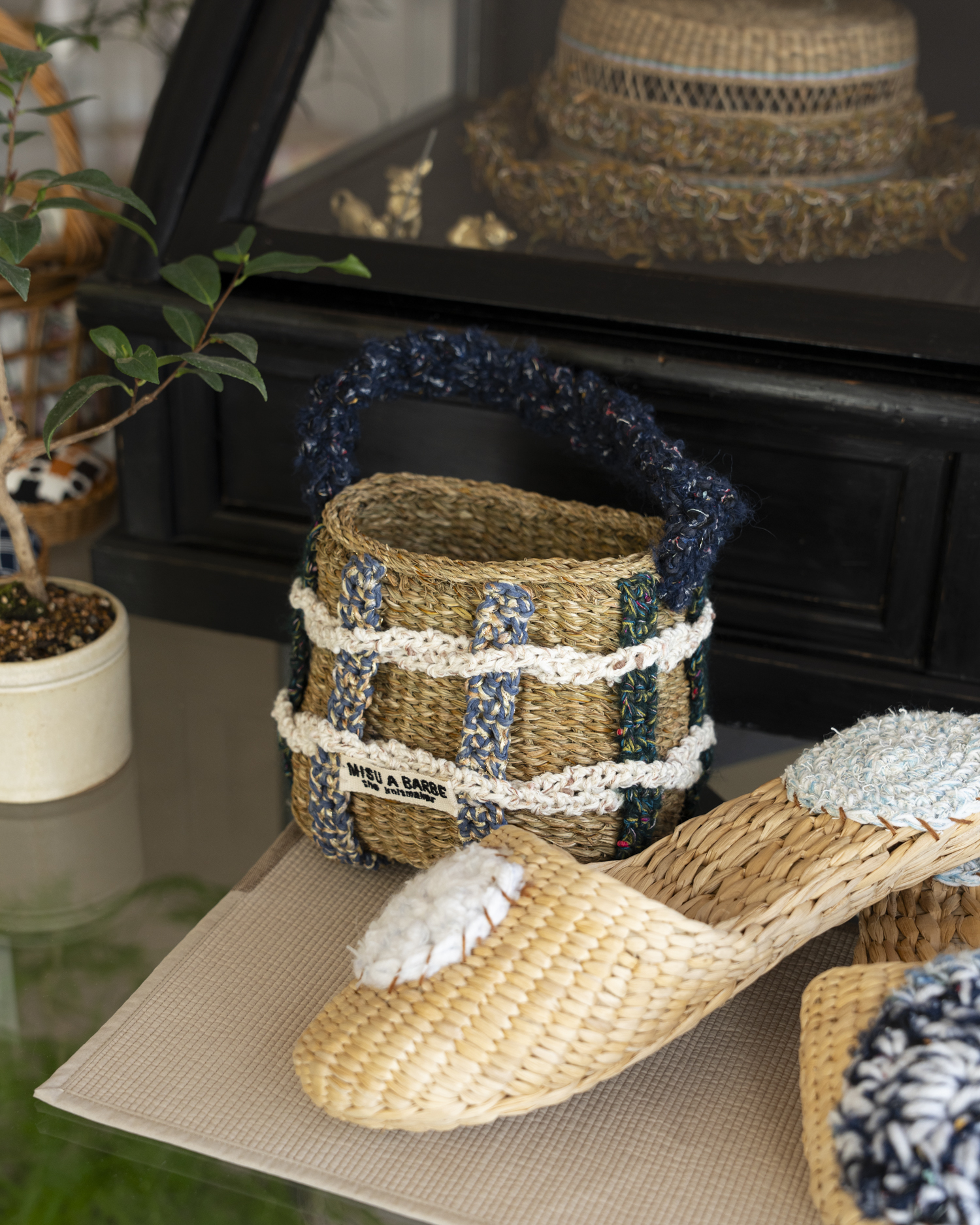 짚풀공예가 강문실 작가의 바구니에, 니트를 중심으로 다양한 가능성을 탐구하는 〈MISU A BARBE〉의 니팅을 더한 〈제주 신서란 바구니 M〉을 소개합니다.