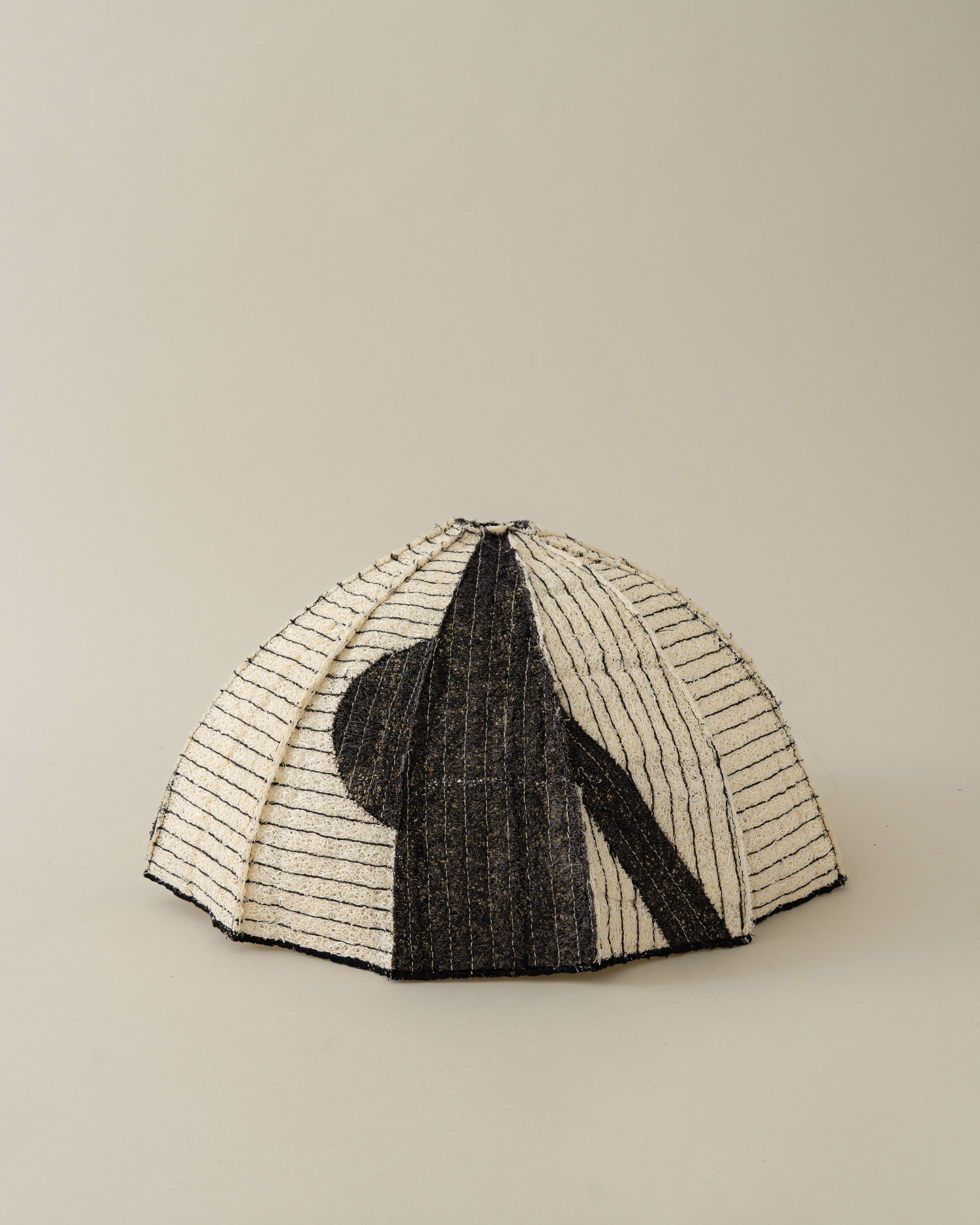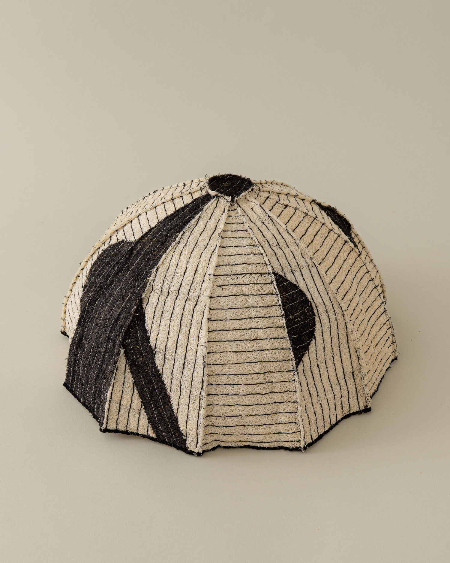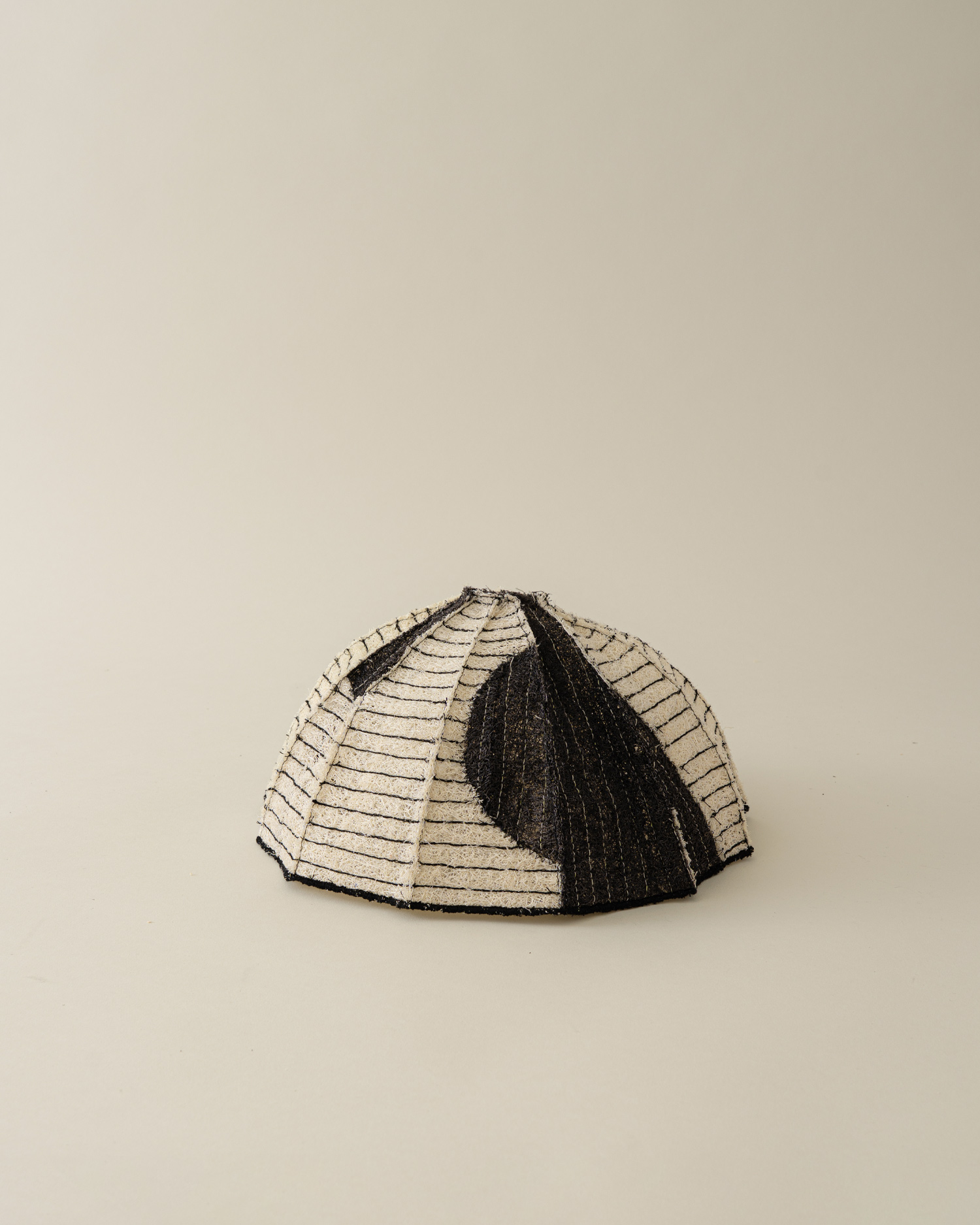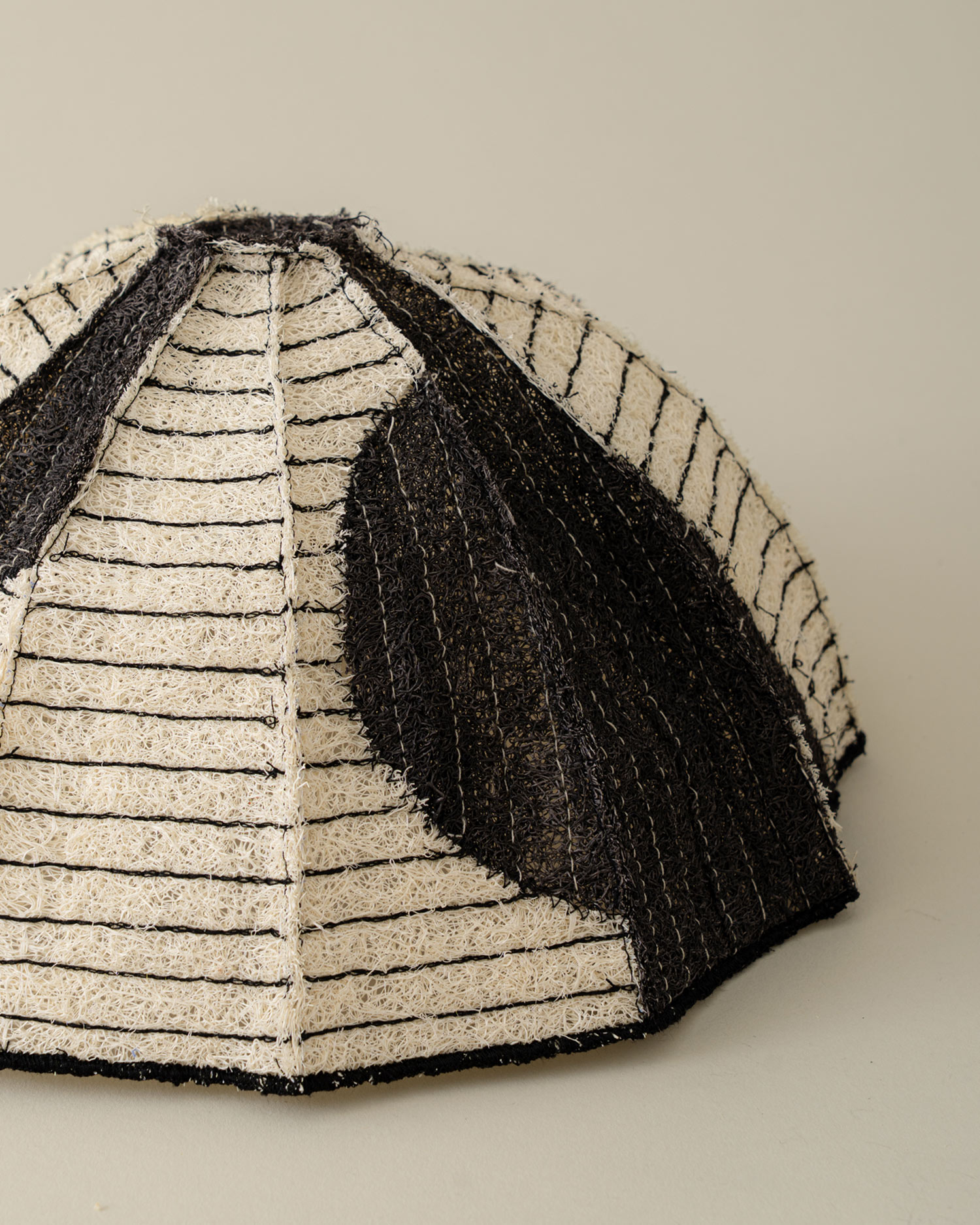 정형화되지 않은 볼륨과 두께, 크기를 지닌 수세미는 단단하면서도 유연하고, 성글어보여도 질깁니다. 검정 실로 일정한 간격으로 스티치를 더해 구조를 단정히 잡았고, 세모꼴의 여러 면을 꼭지점에서 모아 돔을 이루었습니다. 성글어보이는 질감 사이로 드러나는 색실, 천연 염색으로 더한 패턴은 우아하면서도 담백한 멋을 전합니다.