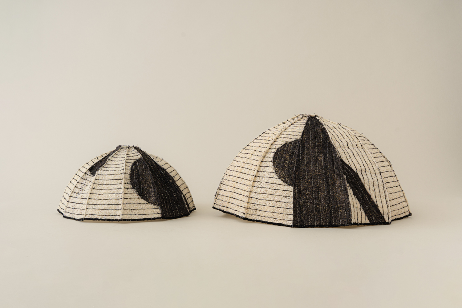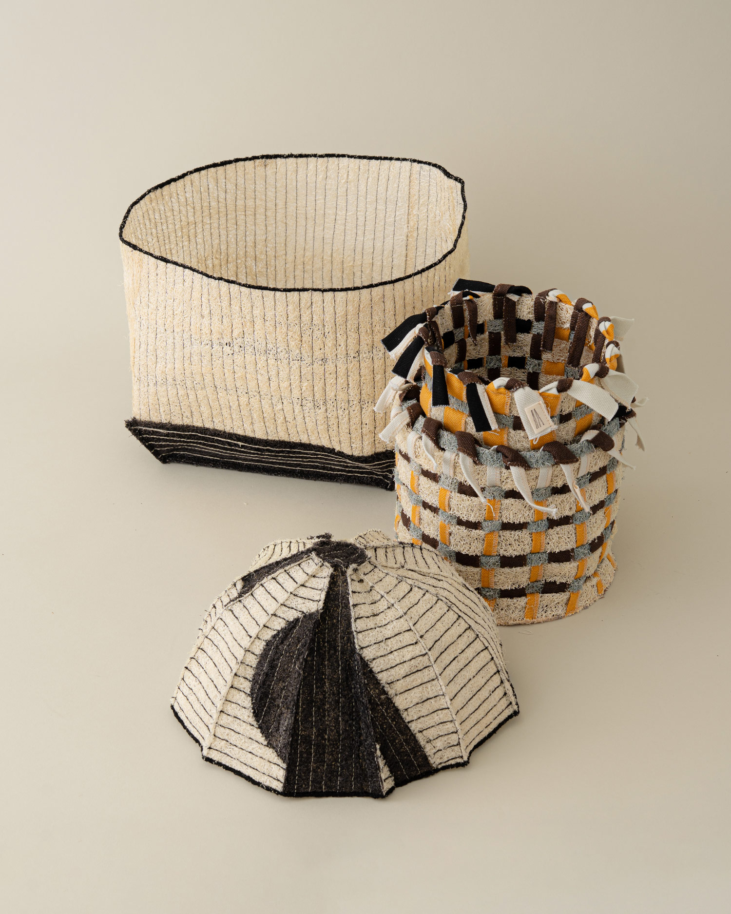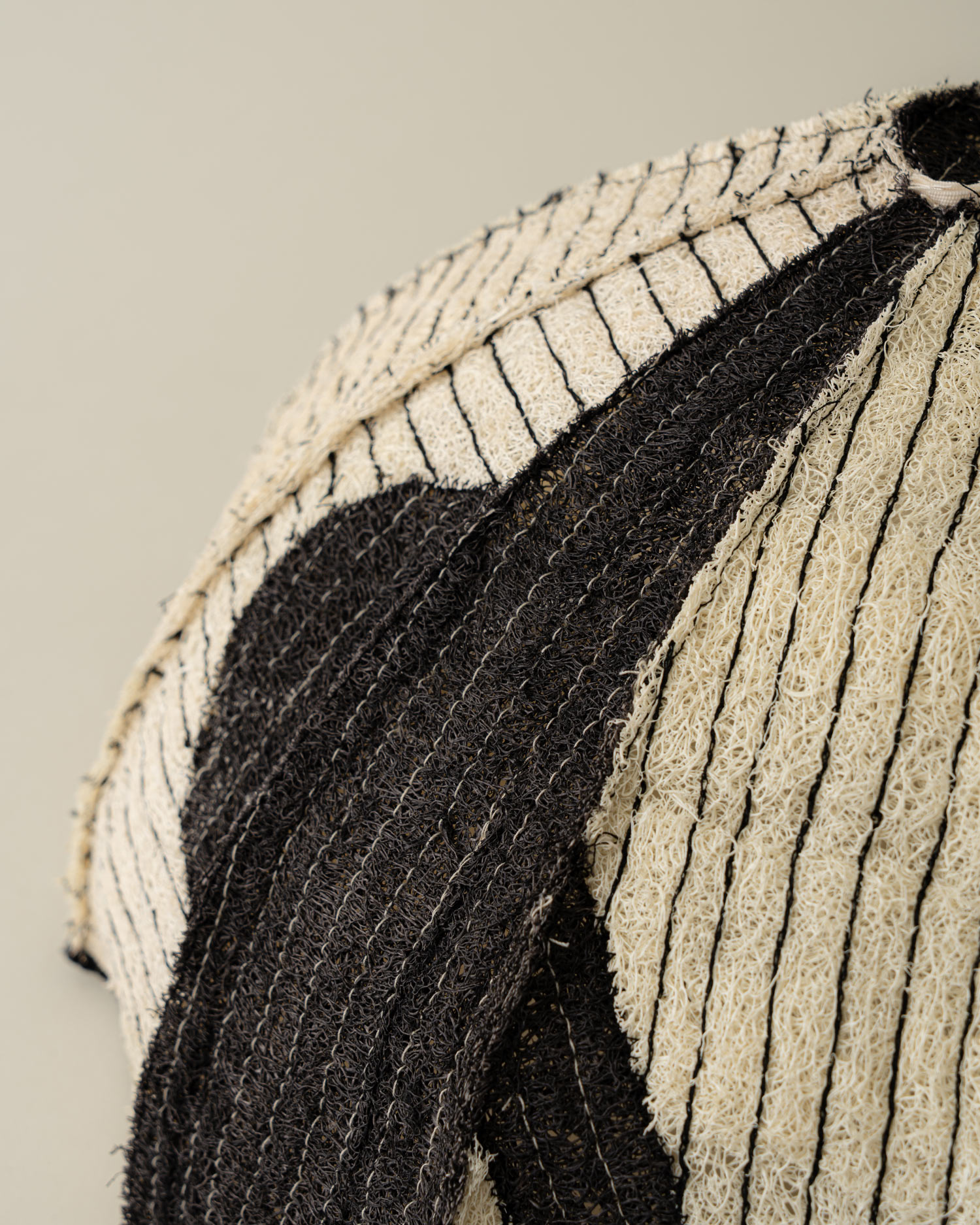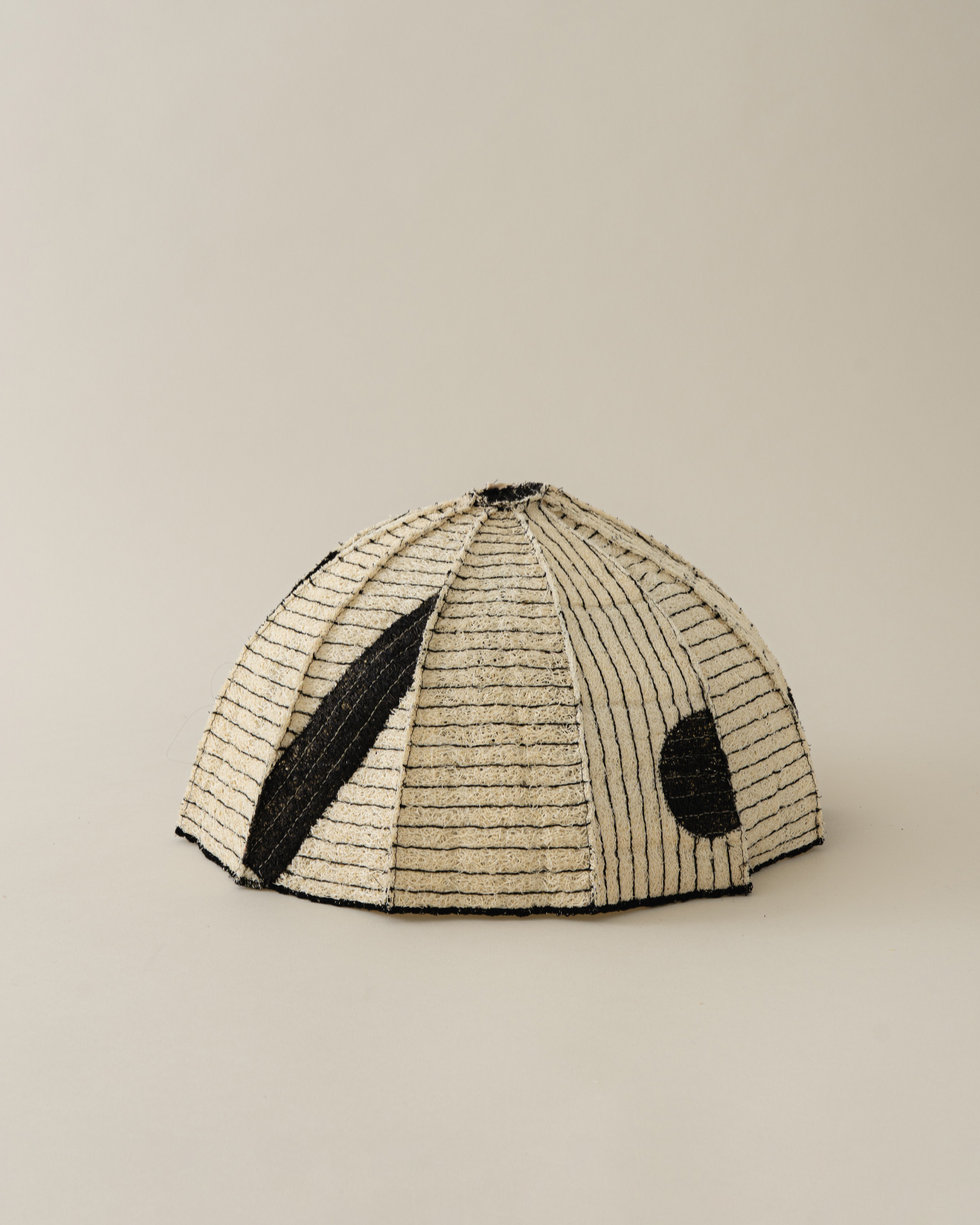 정형화되지 않은 볼륨과 두께, 크기를 지닌 수세미는 단단하면서도 유연하고, 성글어보여도 질깁니다. 검정 실로 일정한 간격으로 스티치를 더해 구조를 단정히 잡았고, 세모꼴의 여러 면을 꼭지점에서 모아 돔을 이루었습니다. 성글어보이는 질감 사이로 드러나는 색실, 천연 염색으로 더한 패턴은 우아하면서도 담백한 멋을 전합니다.