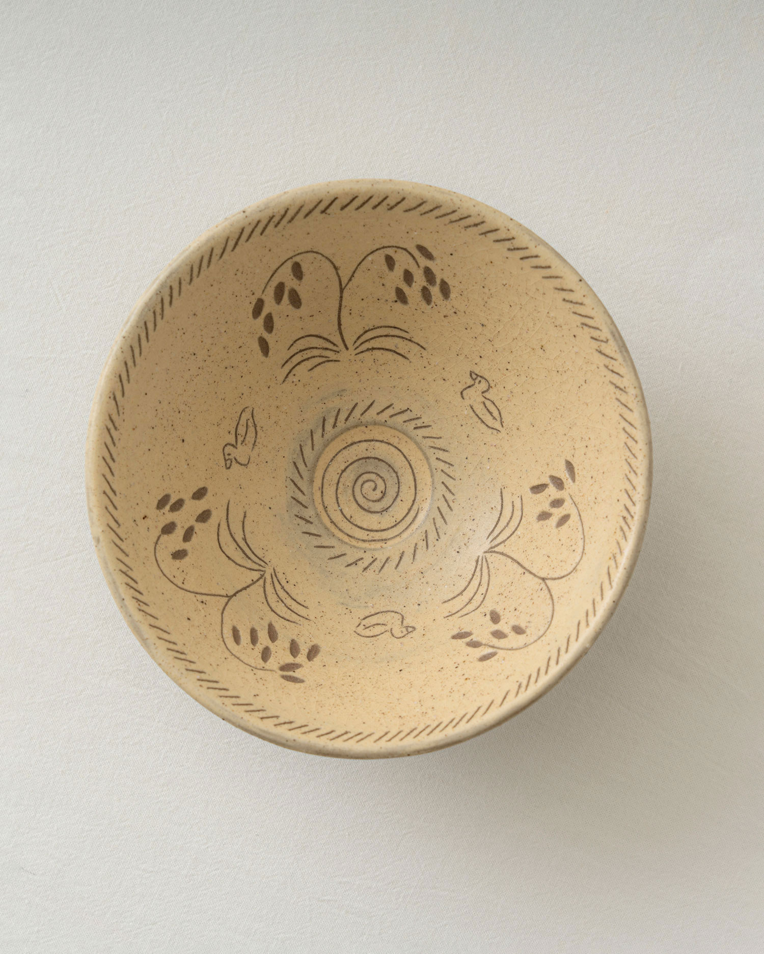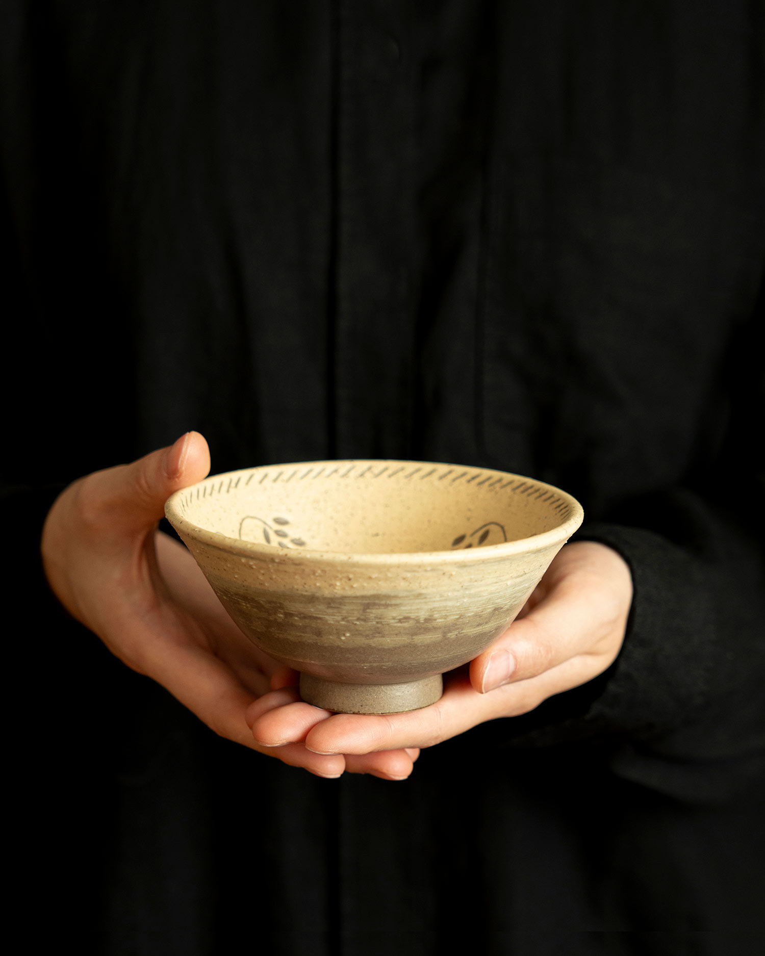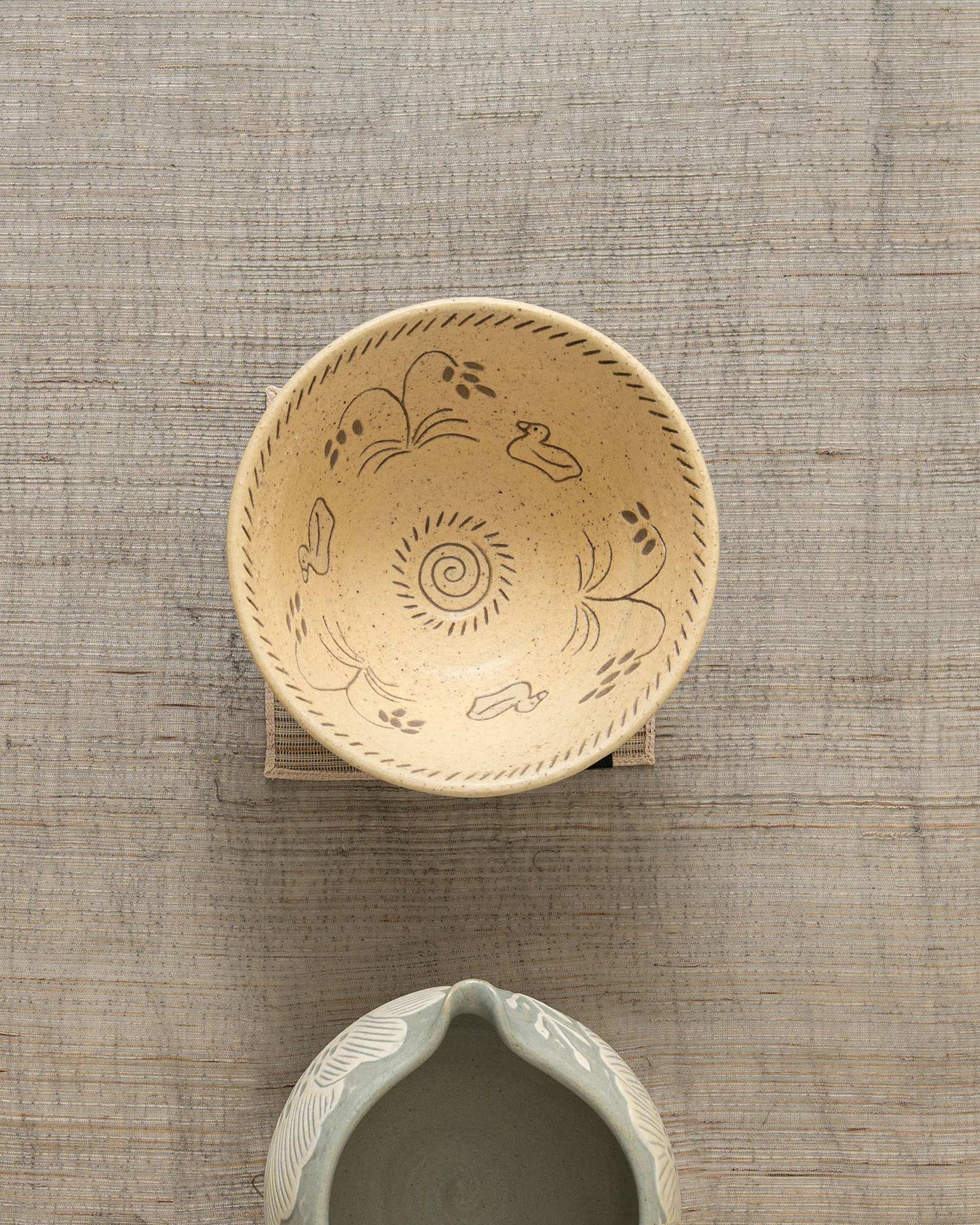 중심부에 홈이 파인 전통 형태의 분청 볼로, 맑은 차를 마시는 찻사발로 사용하거나 간단한 덮밥과 면기, 수프나 샐러드 등 1인용 식사에 적합한 용량입니다. 요거트나 간식을 담는 디저트 볼로 활용하기에도 좋습니다. |