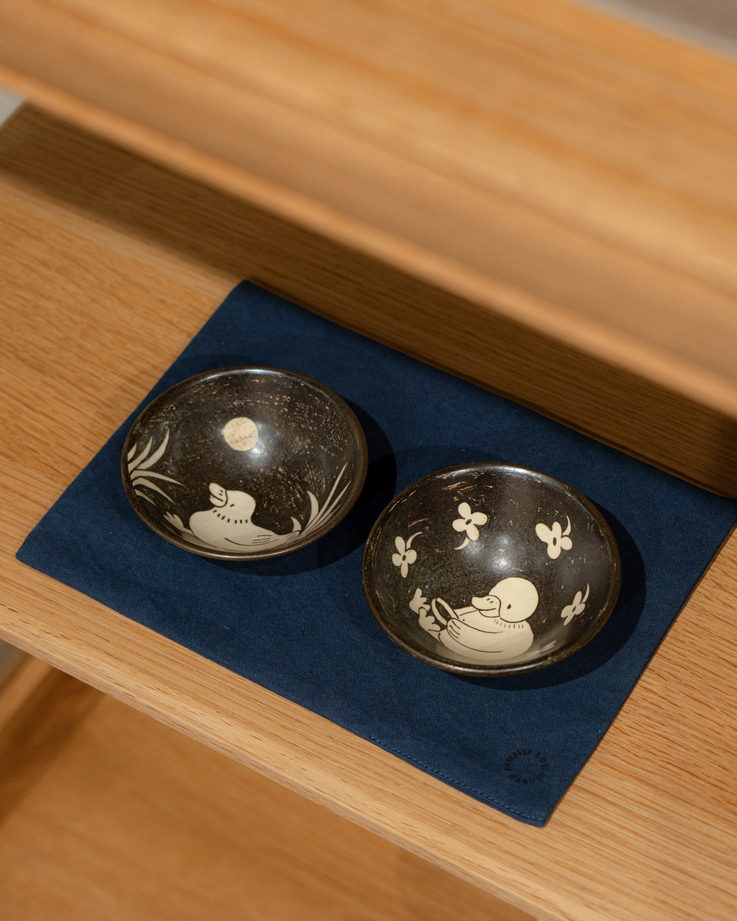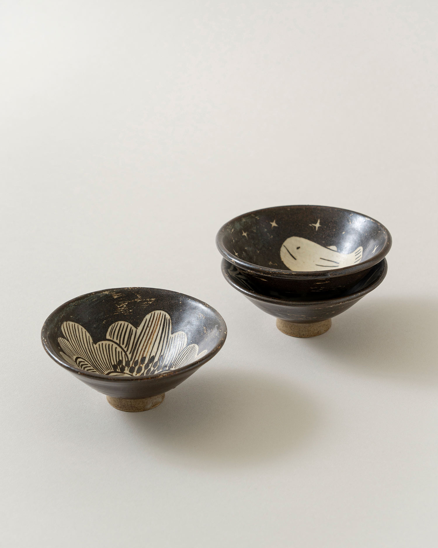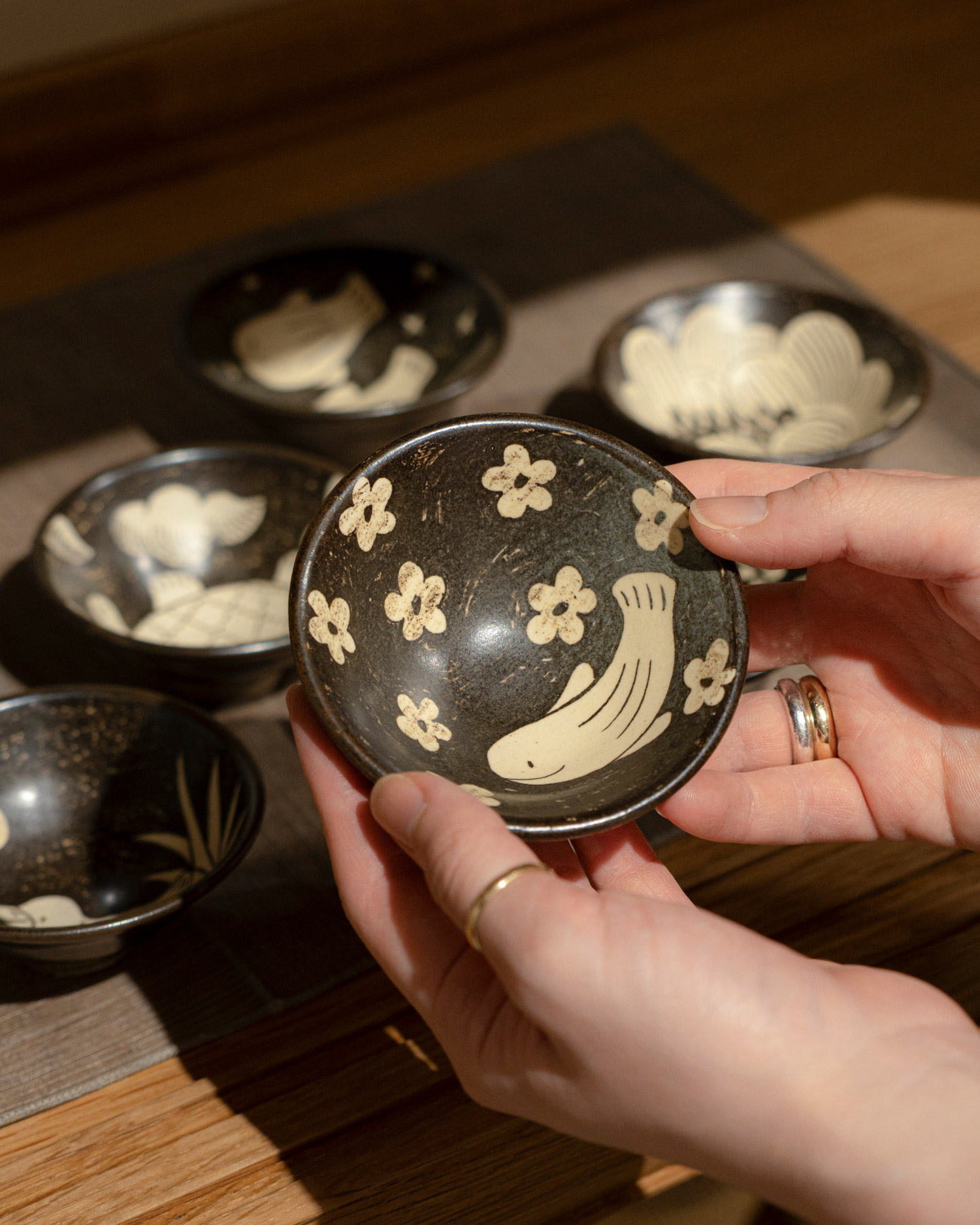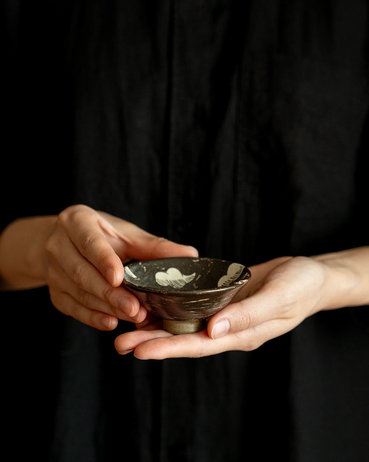분청의 전통 기법인 철채 기법으로 그림을 그린, 이야기가 담긴 찻잔입니다. 철채는 철분이 포함된 안료를 도자기 표면에 붓으로 칠해 장식하는 기법으로, 유약을 바르고 가마에서 구우면 어두운 흑갈색으로 발현되어 특유의 깊이 있는 색감을 만들어냅니다. 마치 깊은 밤 속 조용히 빛나는 별처럼 잔마다 다른 표정을 지니는 것이 매력적이에요.