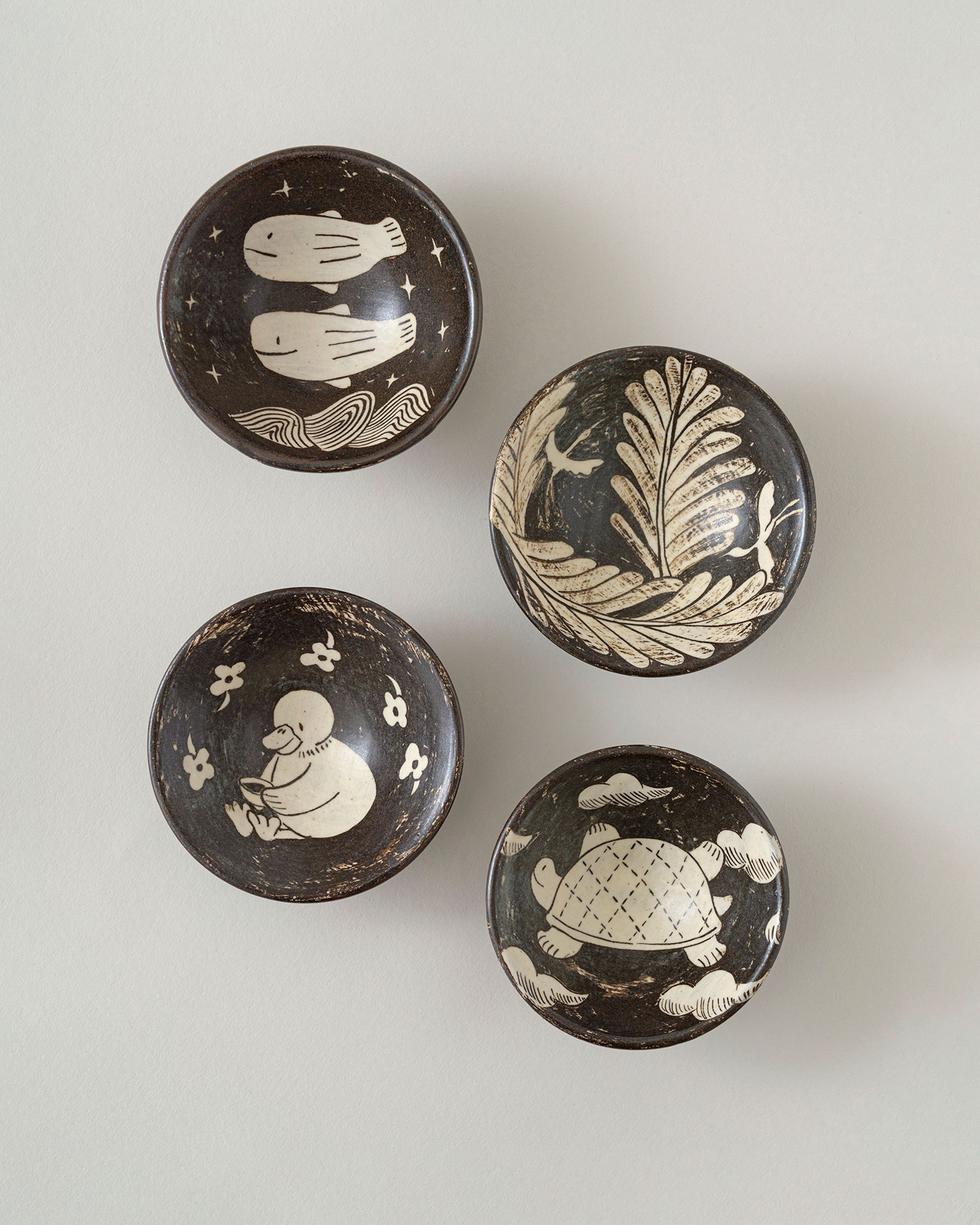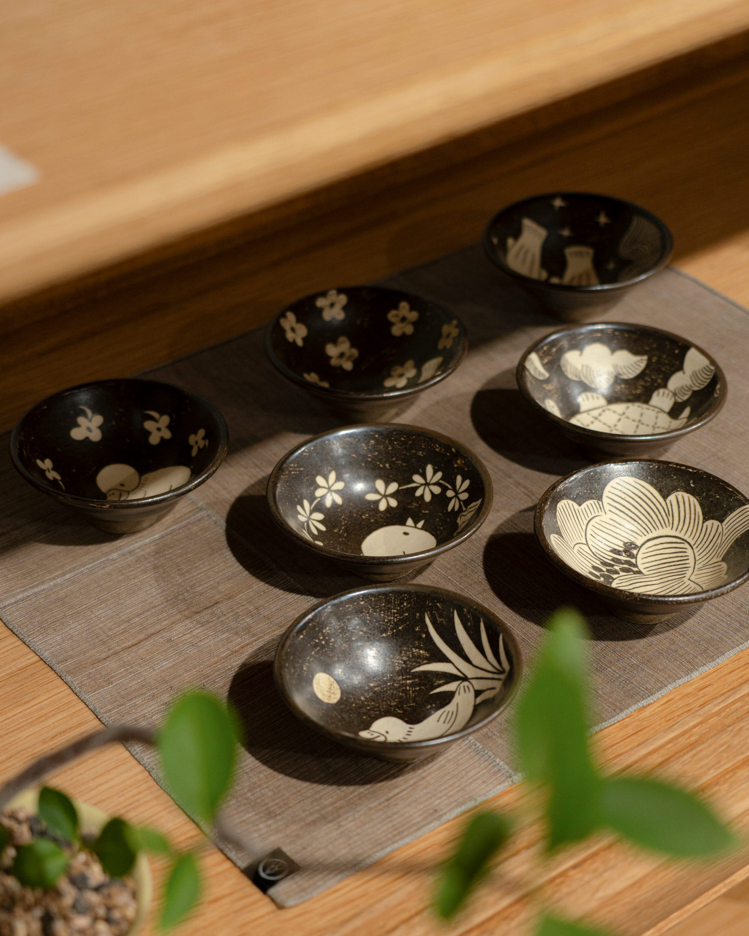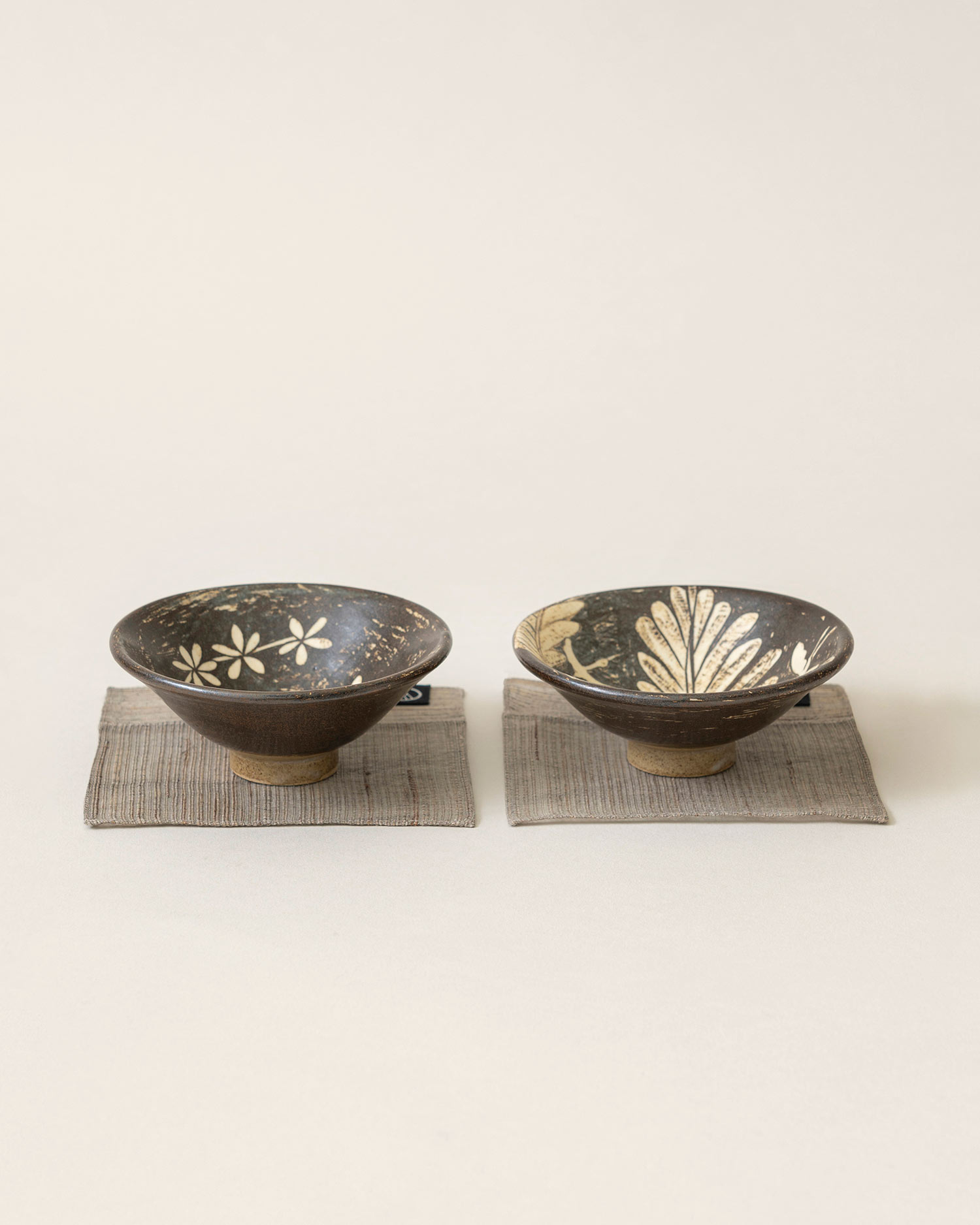 분청의 전통 기법인 철채 기법으로 그림을 그린, 이야기가 담긴 찻잔입니다. 철채는 철분이 포함된 안료를 도자기 표면에 붓으로 칠해 장식하는 기법으로, 유약을 바르고 가마에서 구우면 어두운 흑갈색으로 발현되어 특유의 깊이 있는 색감을 만들어냅니다. 마치 깊은 밤 속 조용히 빛나는 별처럼 잔마다 다른 표정을 지니는 것이 매력적이에요.