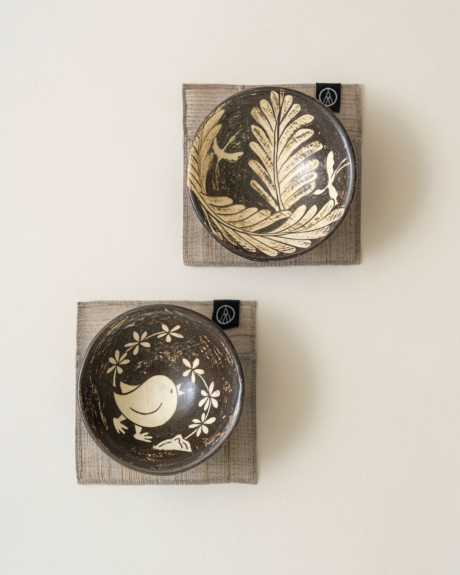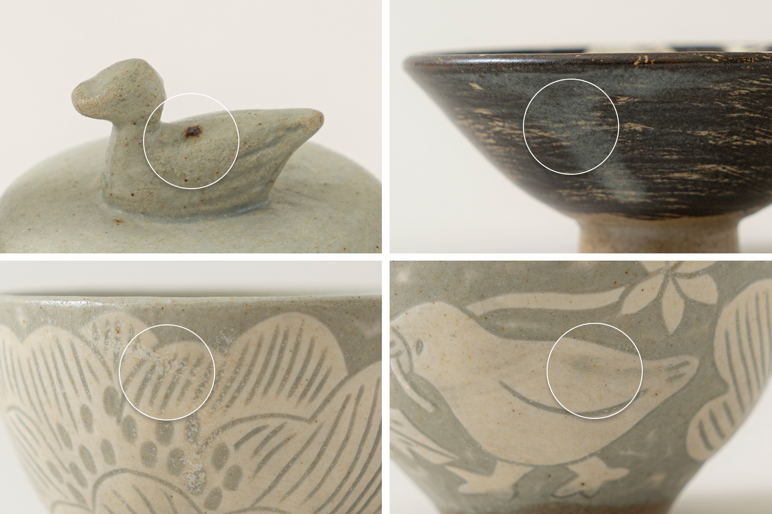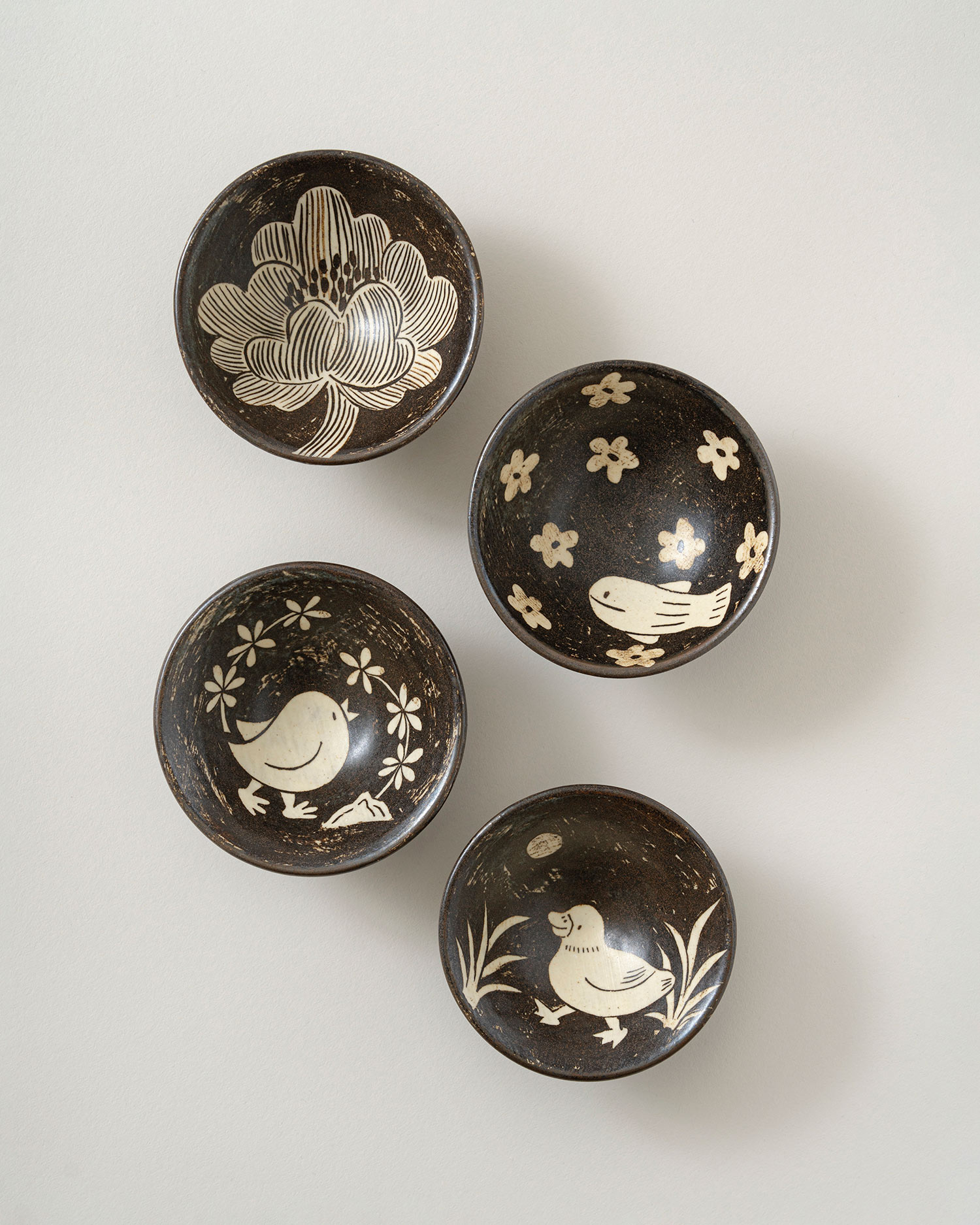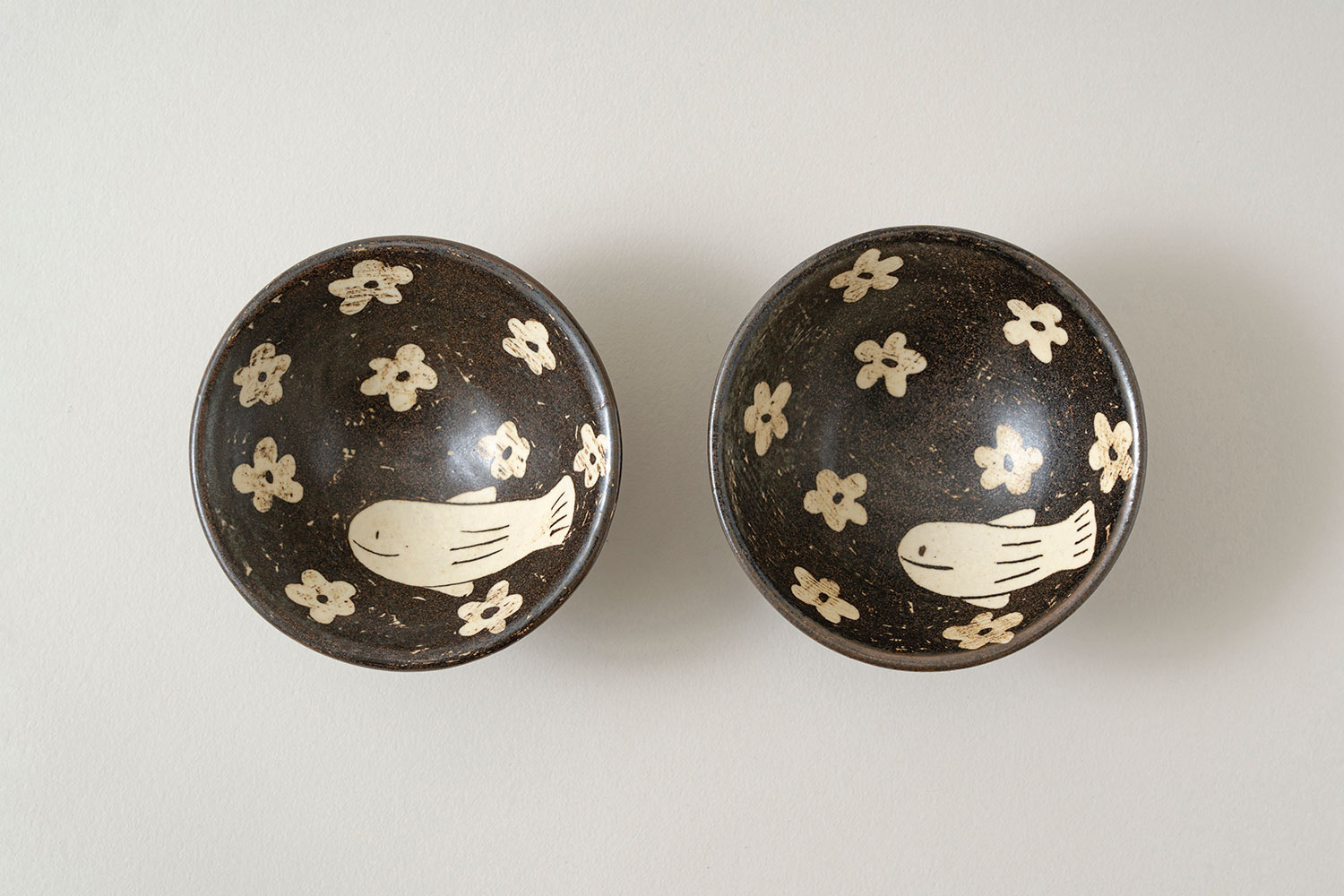 분청의 전통 기법인 철채 기법으로 그림을 그린, 이야기가 담긴 찻잔입니다. 철채는 철분이 포함된 안료를 도자기 표면에 붓으로 칠해 장식하는 기법으로, 유약을 바르고 가마에서 구우면 어두운 흑갈색으로 발현되어 특유의 깊이 있는 색감을 만들어냅니다. 마치 깊은 밤 속 조용히 빛나는 별처럼 잔마다 다른 표정을 지니는 것이 매력적이에요.