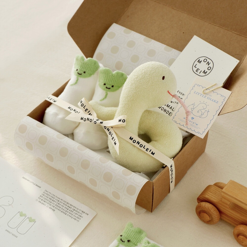 2025년 뱀띠해 에디션으로 구성한 특별한 선물 세트로, 햇뱀 딸랑이 인형과 새싹 양말이 함께 담겨 있습니다. 푸른 뱀의 해에 태어난 아기에게 따뜻한 마음을 담아 선물해 보세요.