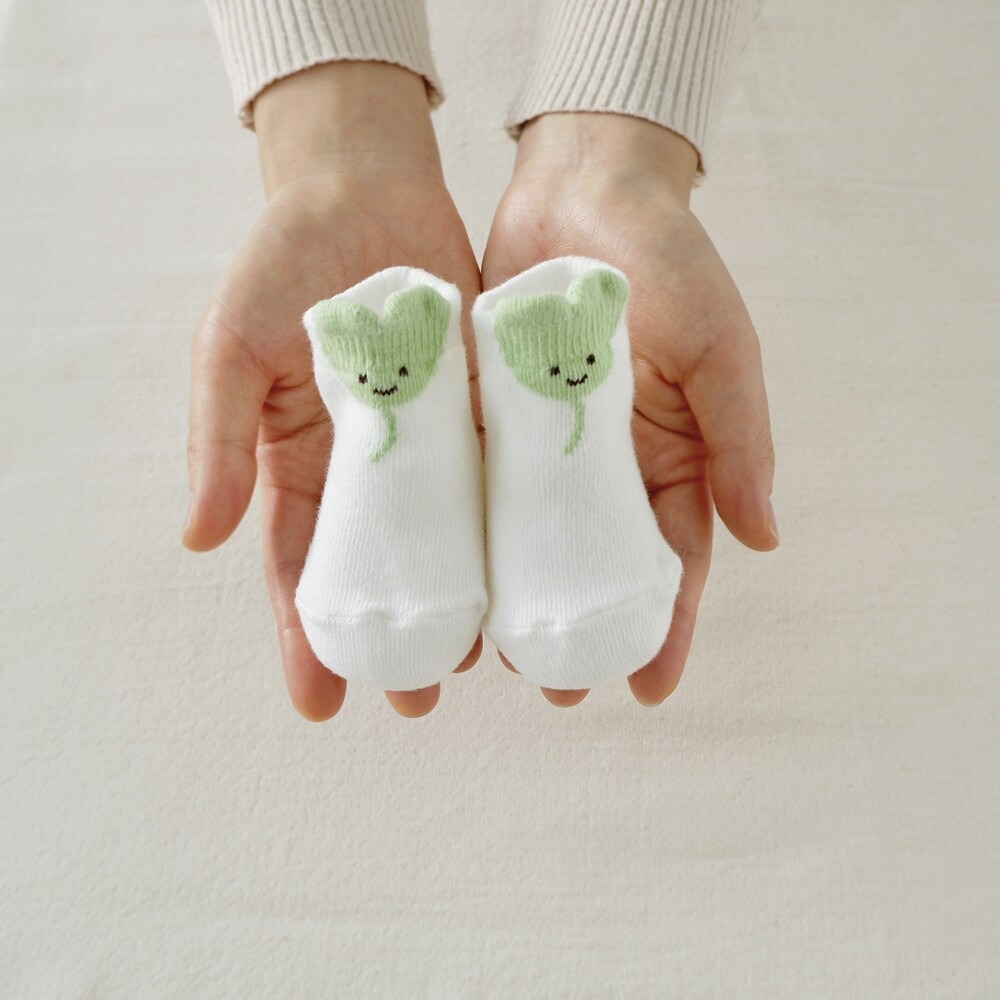 새싹 양말 뽀얀 바탕 위로 연둣빛 새순을 빼꼼 내민 사랑스러운 신생아 양말입니다. 남아와 여아 구분 없이 신기실 수 있는 귀여운 새싹 디자인으로 만삭 촬영 시 소품으로 함께하면 소중한 사진을 남기실 수 있습니다.