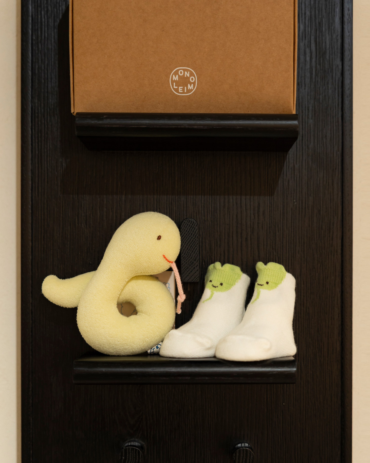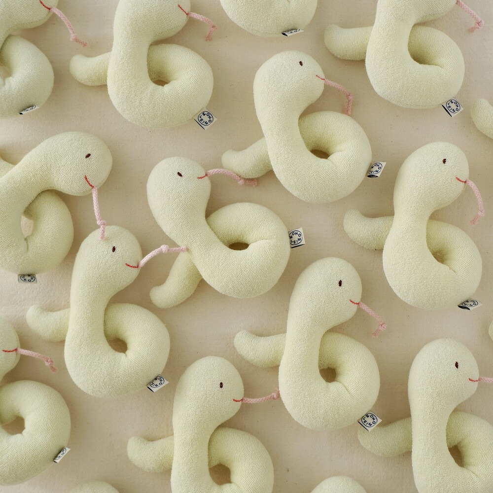 푸른 뱀의 해에 태어난 아기를 위한 선물 엄마와 아기의 일상에 따뜻한 즐거움을 전해주는 패브릭 제품을 만드는 〈모노레임〉의 〈Snake Toy & Socks Set〉을 소개합니다.