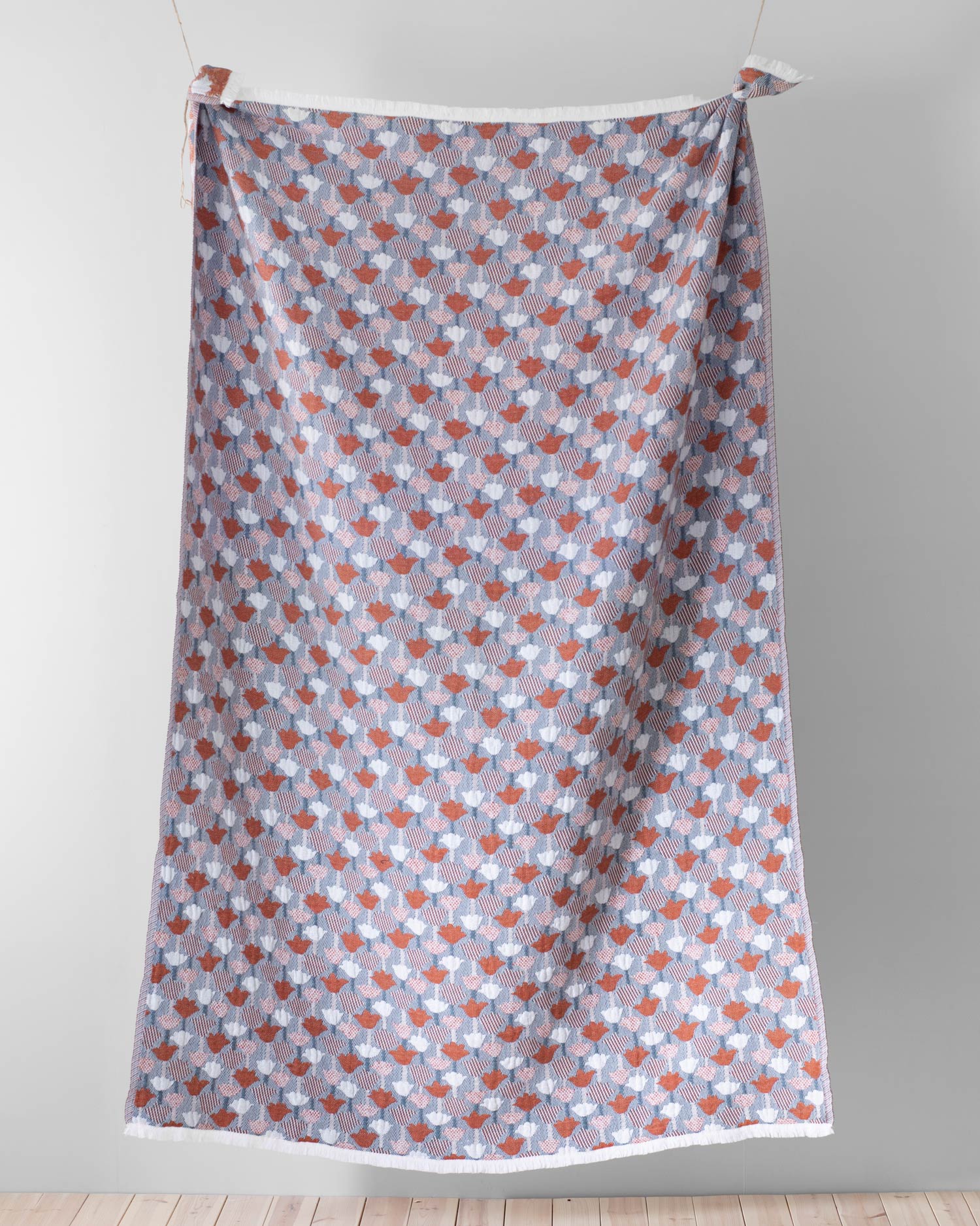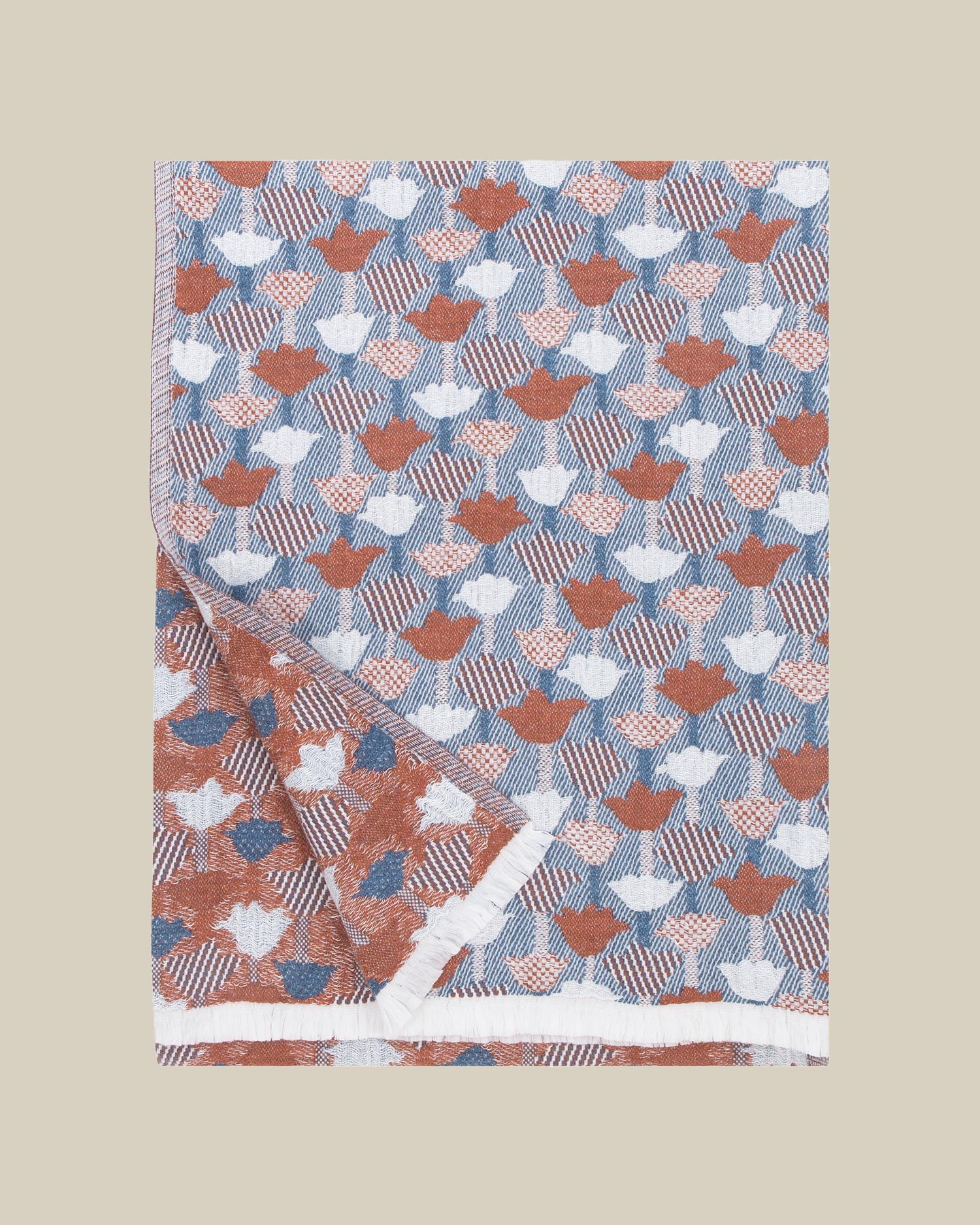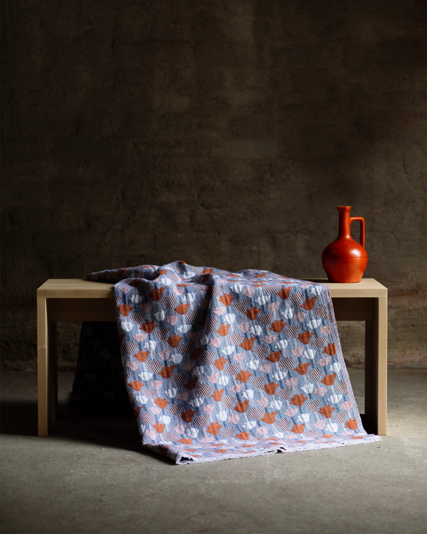 〈TULPPAANI〉는 알토 대학교를 졸업한 핀란드 패턴 디자이너 Helmi Liikanen가 디자인한 패턴으로, 튤립의 모티프를 다양한 짜임과 입체적 모양으로 표현한 것이 특징입니다. 서로 다른 직조 방식과 경사 밀도를 실험적으로 결합해 리넨과 울을 섞어 짜낸 구조적이고 다층적인 블랭킷이에요.