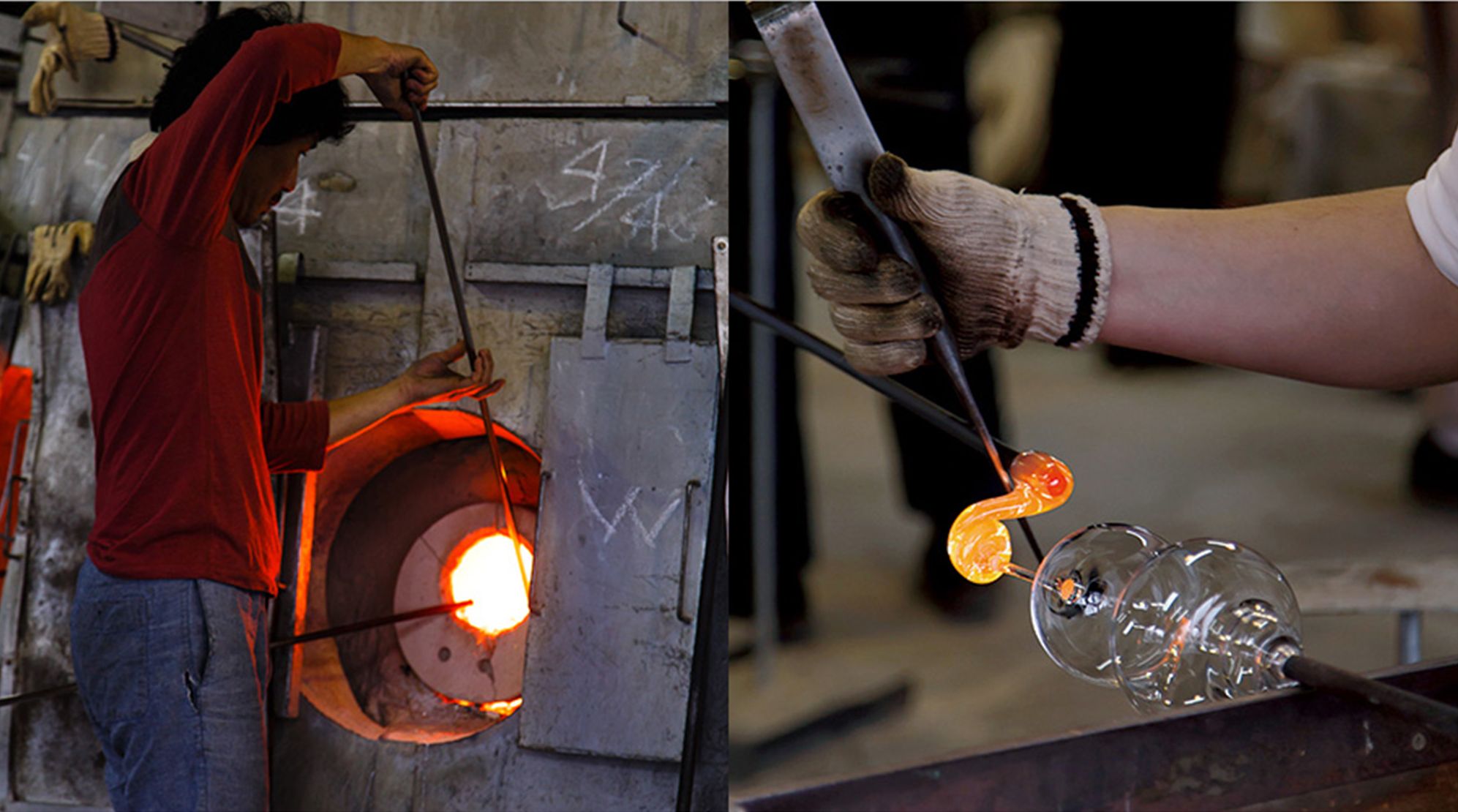 - 유리의 지속적으로 변화하는 조건을 결정하고, 공기를 불어넣는 힘과 속도를 미세하게 조절해가며 균일한 형태를 만드는 작업이기 때문에 오랫동안 함께 작업을 해온 장인과 숙련공의 작업으로 만들어집니다. |