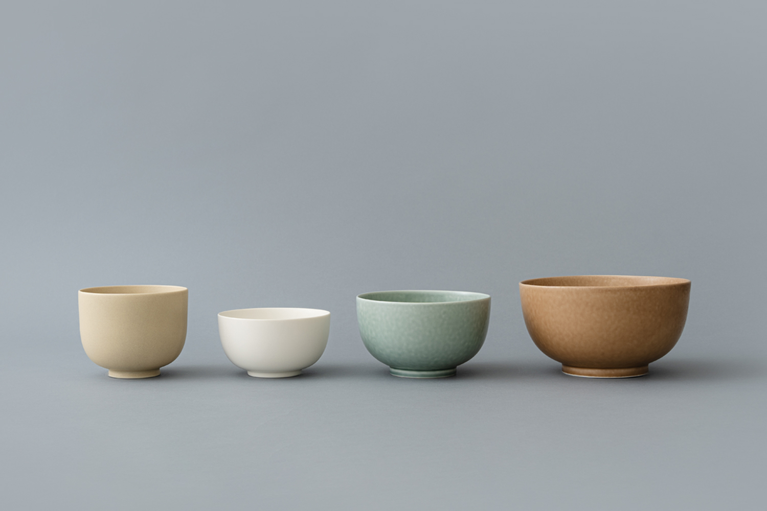 동일 시리즈인 〈ReIRABO Bowl〉의 S, M, L과 나란히 놓아보았습니다. 말차 다완은 S와 M 중간에 해당하는 용량입니다. |