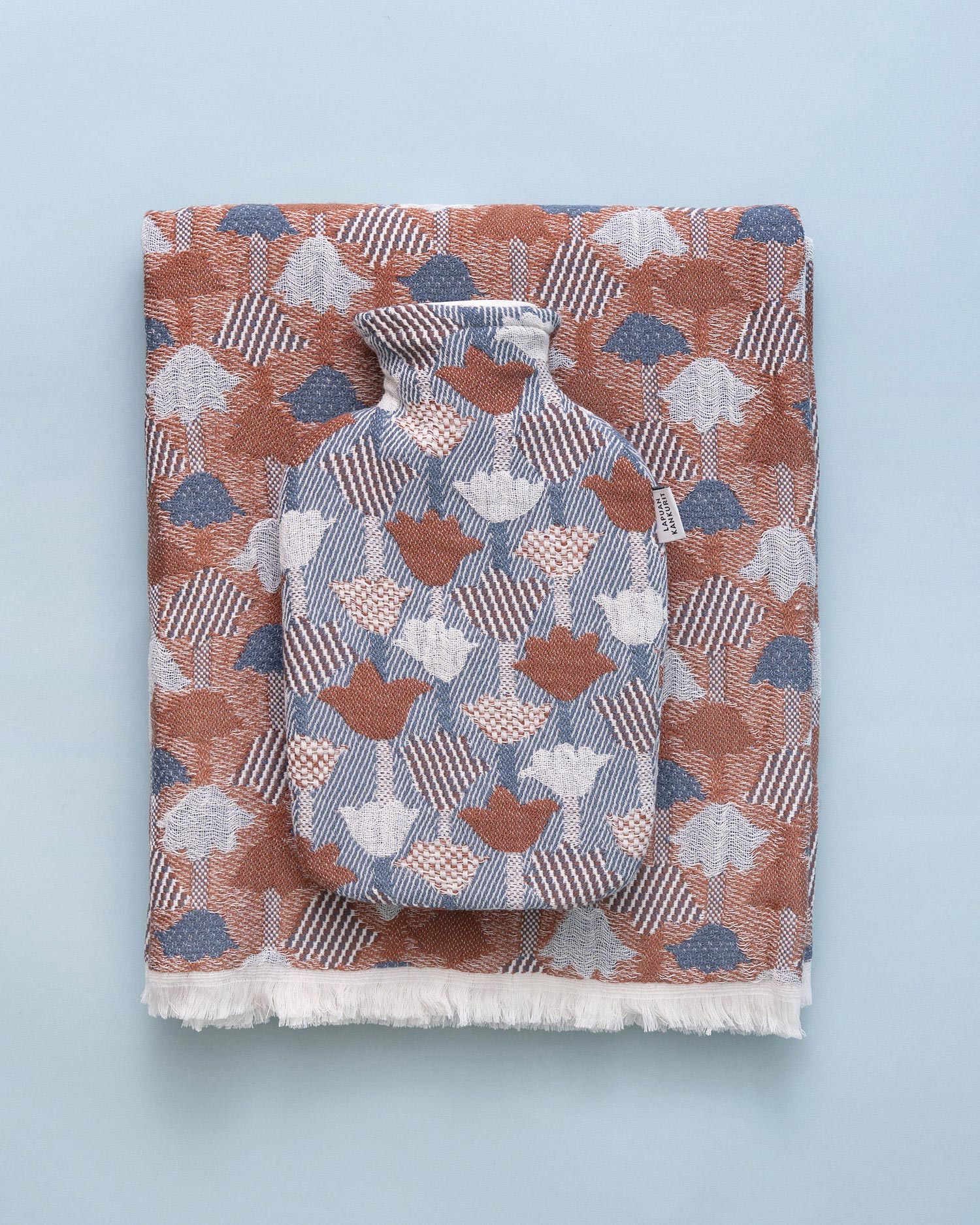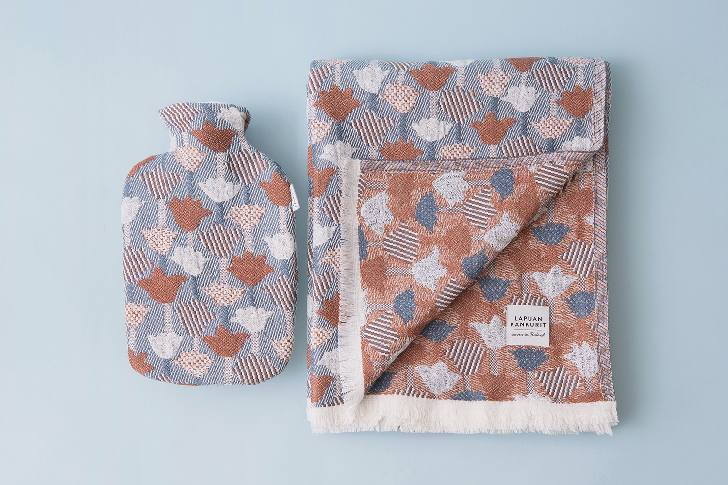 튤립을 껴안는 따뜻한 겨울 핀란드 패브릭 브랜드 〈Lapuan Kankurit〉의 베스트셀러 패턴 〈TULPPAANI〉로 구성한 〈울 블랭킷 & 핫워터보틀 SET - TULPPAANI Cinnamon & Blue〉를 소개합니다. 같은 패턴과 컬러의 조합으로 함께 찾는 분들이 많아 겨울 내내 든든하게 사용할 두 아이템을 특별히 세트 구성으로 준비했습니다.