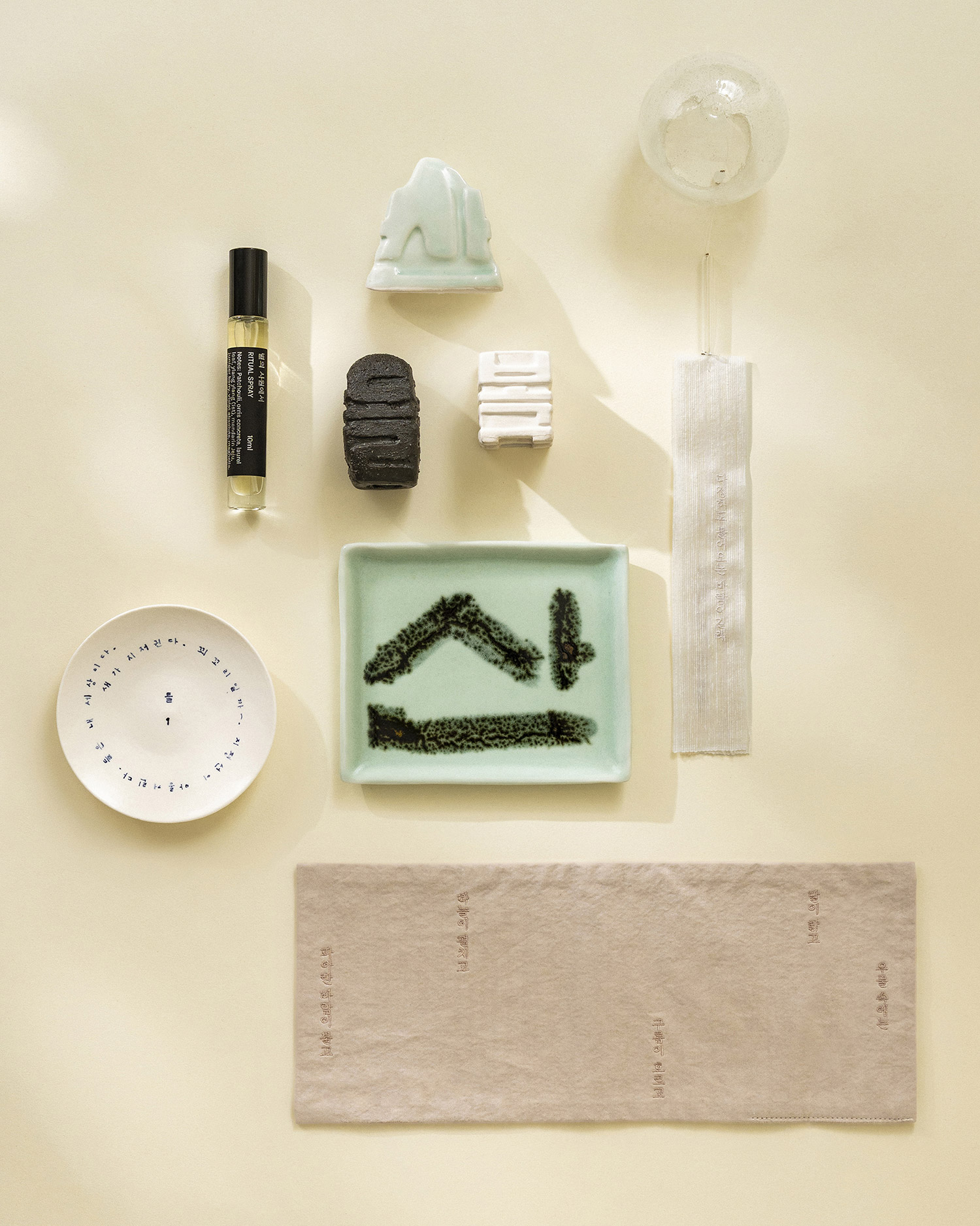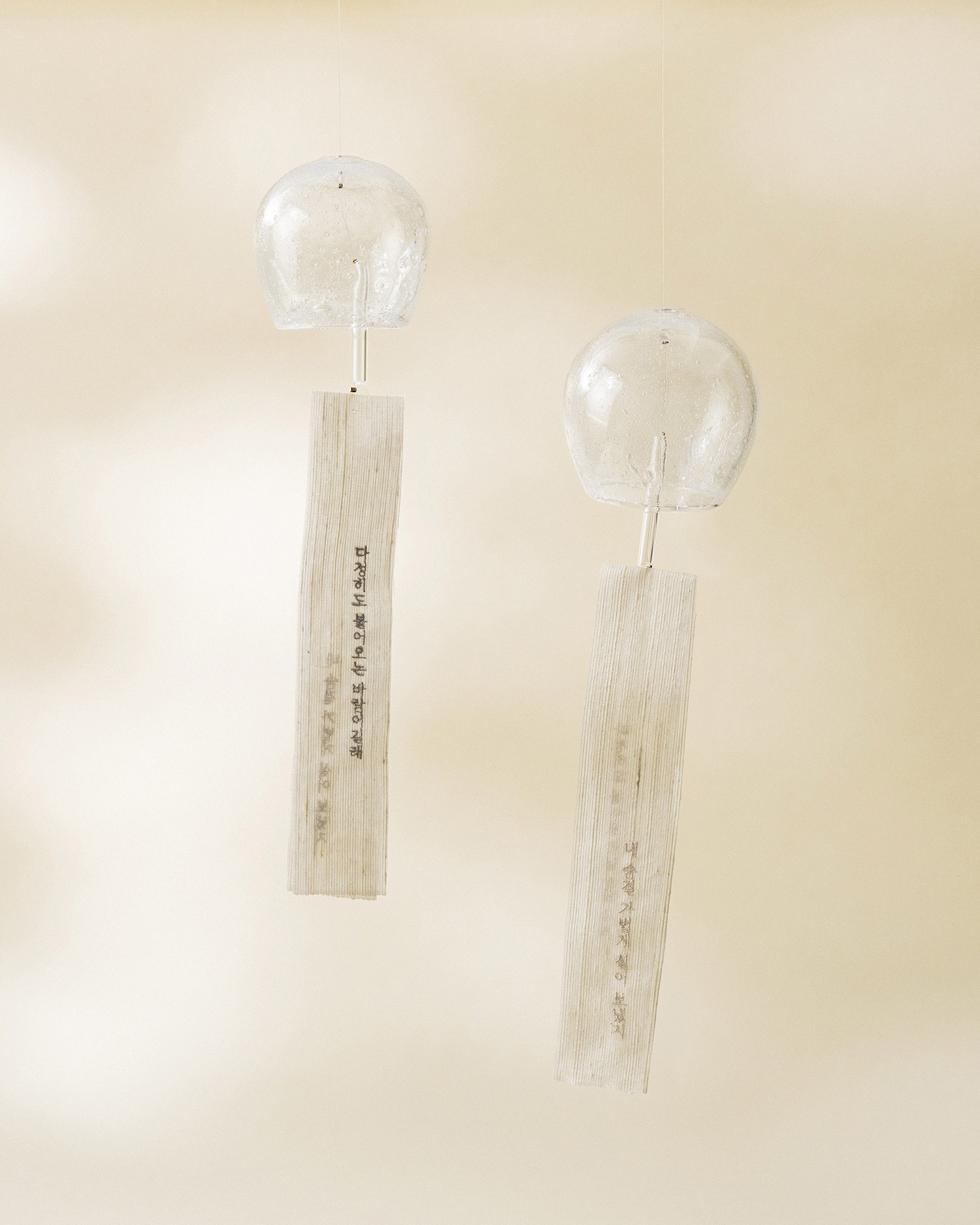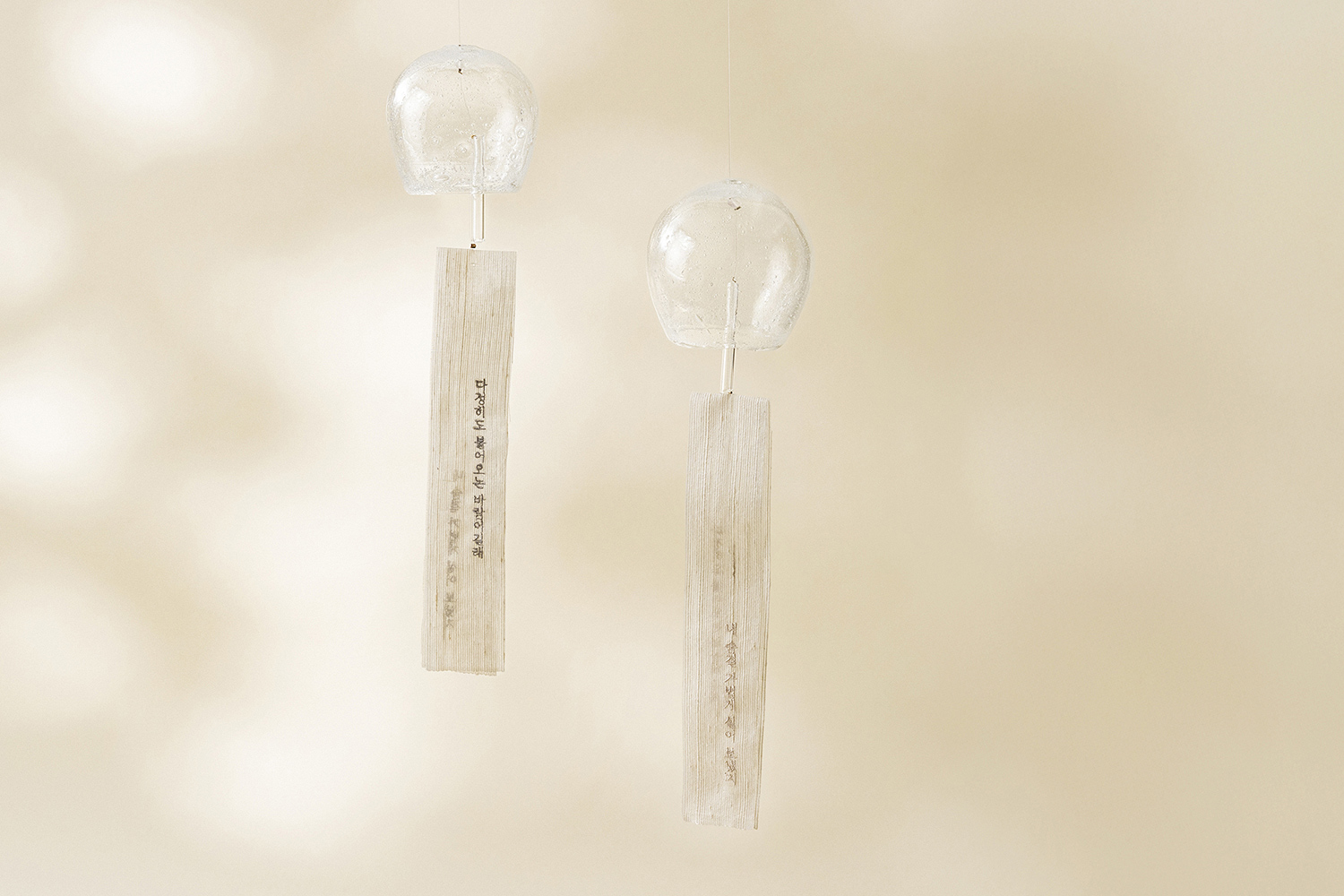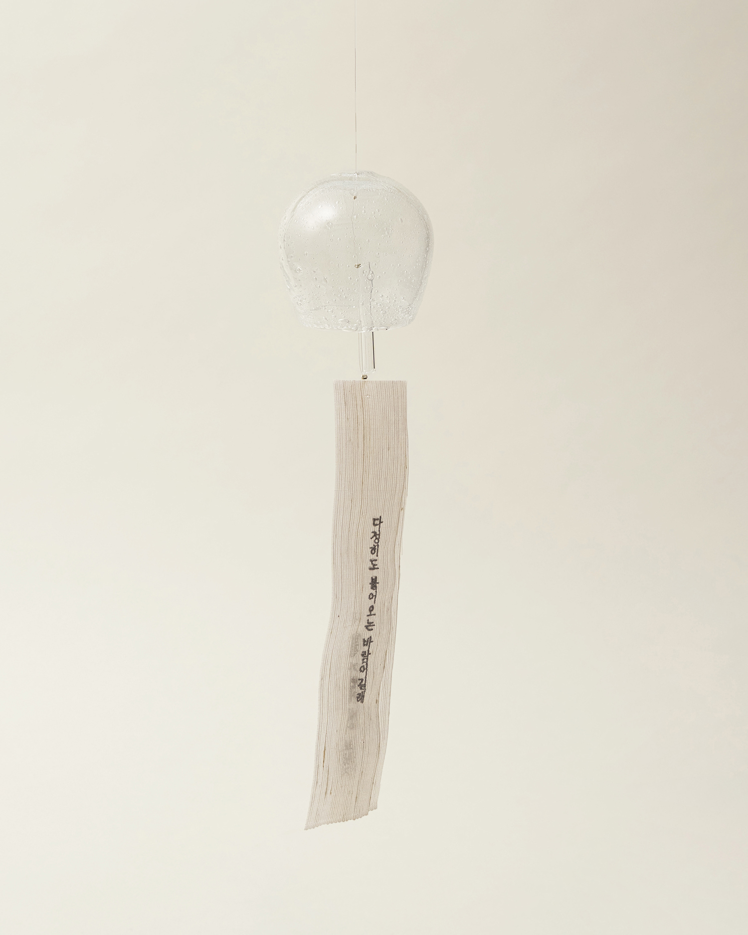청아한 소리와 빛이 공기 중에 흩어지며 마음에 깨끗한 여운을 남기는 〈handle with care〉의 〈다정한 바람 - 유리 풍경〉입니다. 〈마버글라스〉의 이승정 작가가 한 점씩 블로잉 기법으로 제작한 유리 헤드에, 김영랑 시 『다정히도 불어오는 바람』의 시어를 새긴 허호 장인의 함창 명주 스트랩을 더해 완성했습니다.